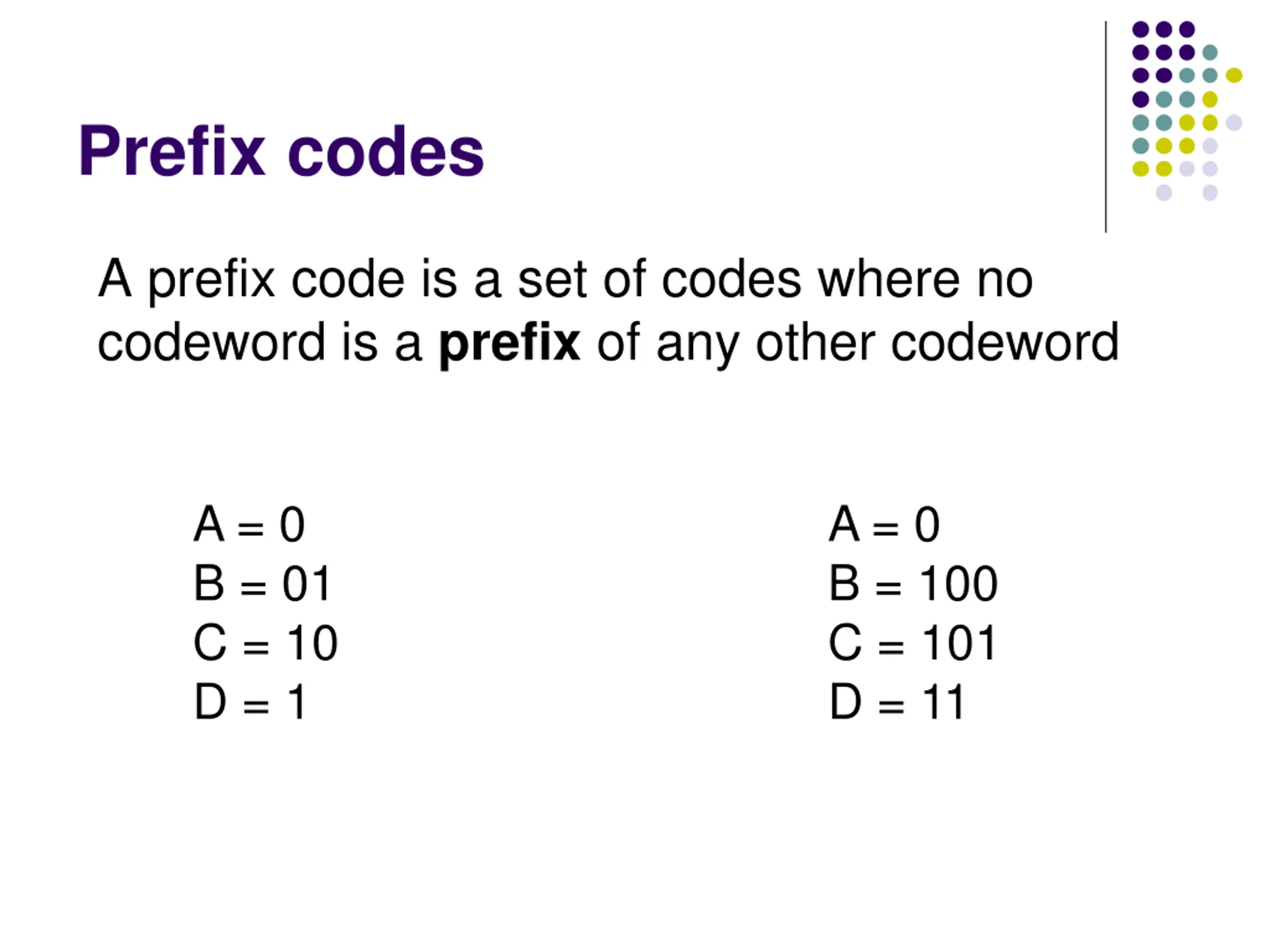 Prefix codes A prefix code is a set of codes where no codeword is a prefix of any other codeword A = 0 B = 01 C = 10 D = 1 A = 0 B = 100 C = 101 D = 11