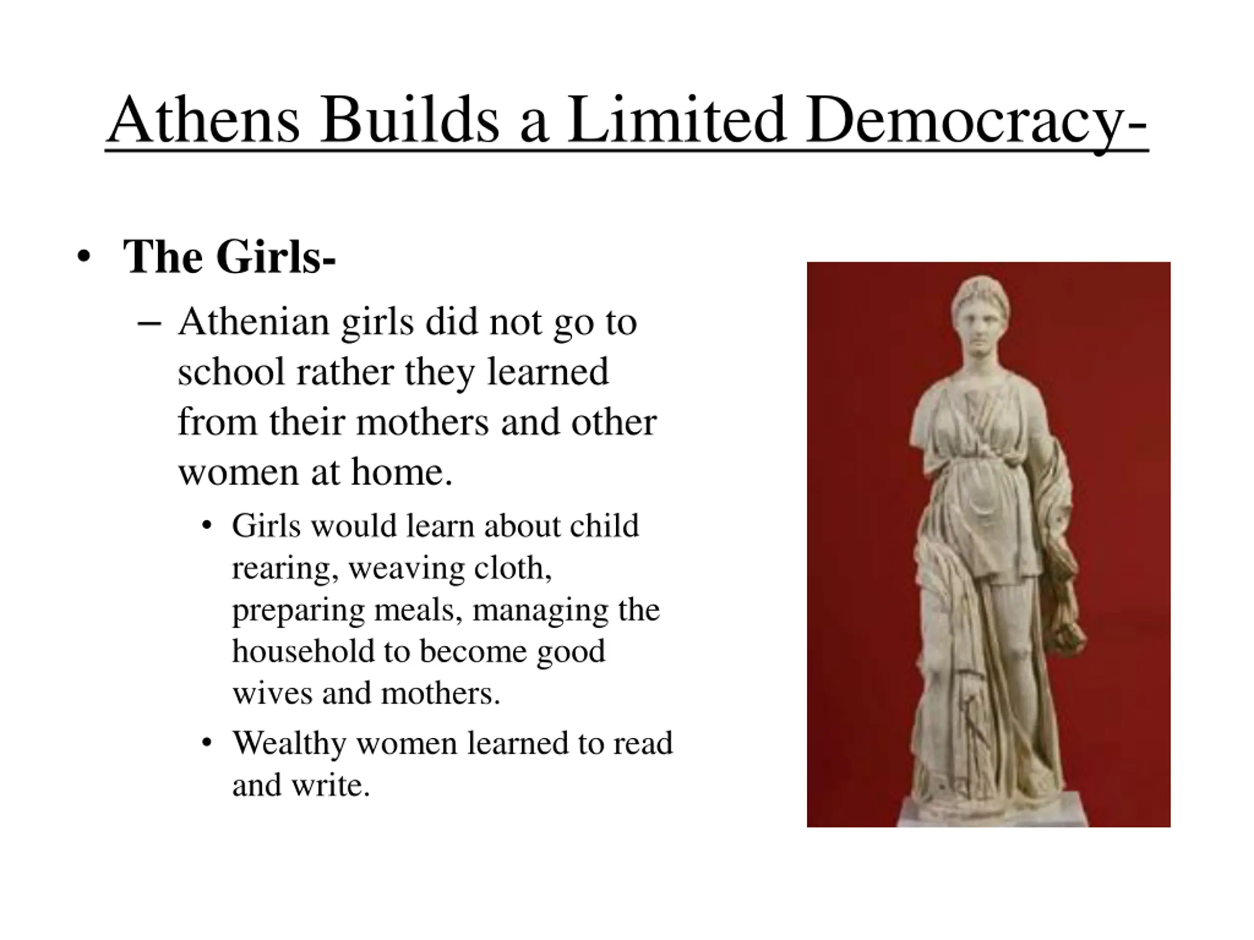 Athens Builds a Limited Democracy- The Girls- Athenian girls did not go to school rather they learned from their mothers and other women at home. Girls would learn about child rearing, weaving cloth, preparing meals, managing the household to become good wives and mothers. Wealthy women learned to read and write.