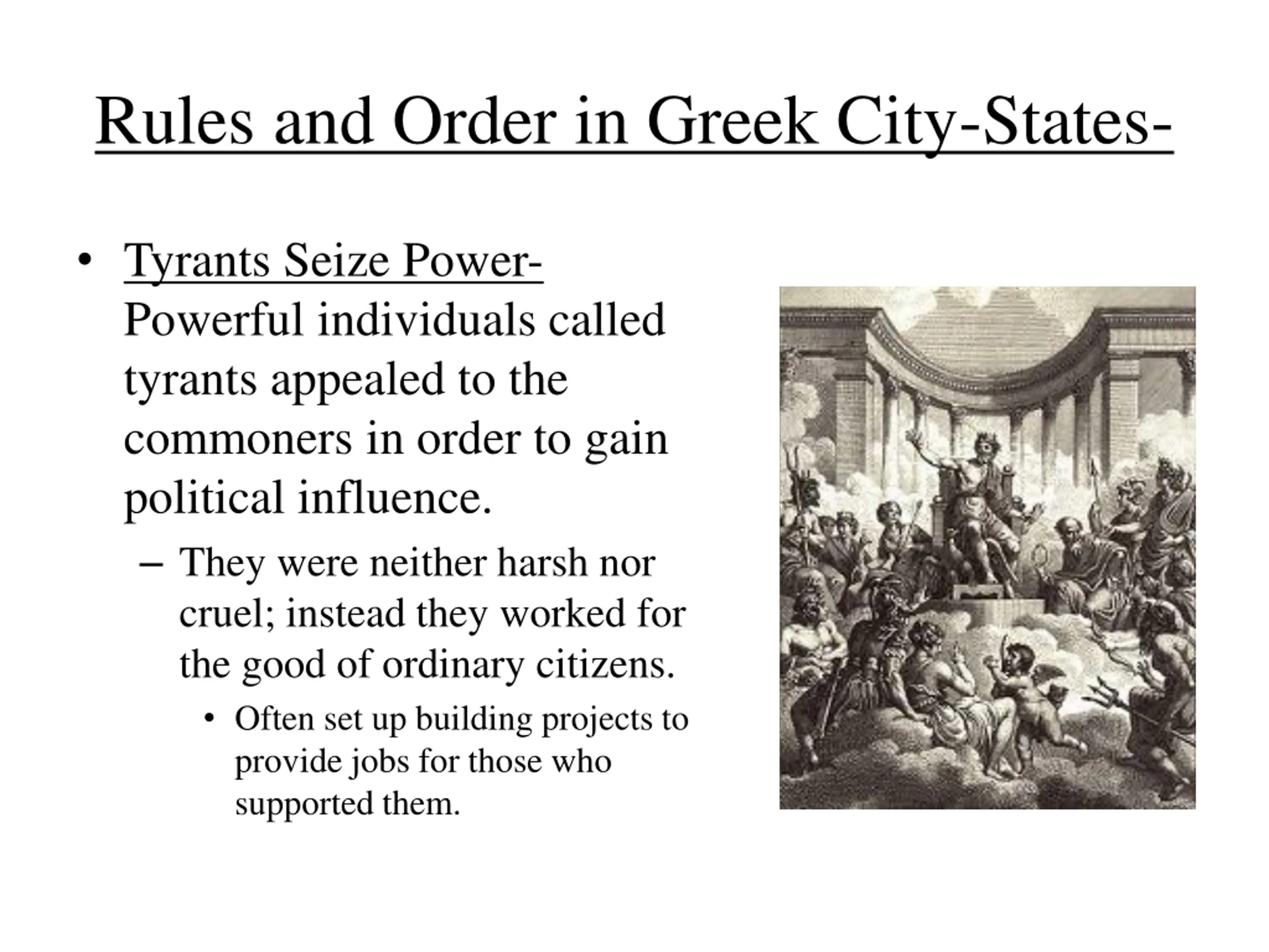 Rules and Order in Greek City-States- Tyrants Seize Power- Powerful individuals called tyrants appealed to the commoners in order to gain political influence. They were neither harsh nor cruel; instead they worked for the good of ordinary citizens. Often set up building projects to provide jobs for those who supported them.