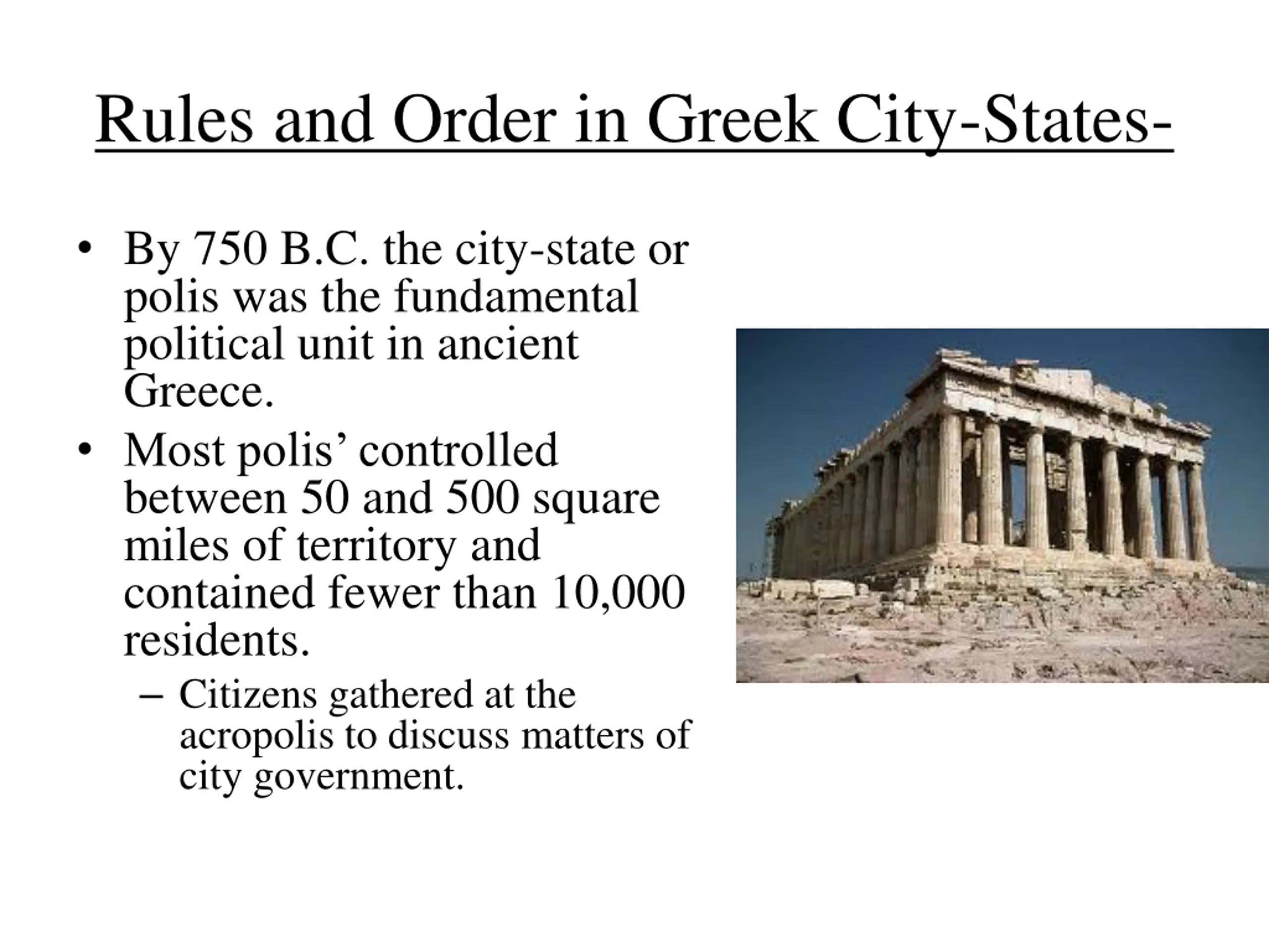 Rules and Order in Greek City-States- By 750 B.C. the city-state or polis was the fundamental political unit in ancient Greece. Most polis controlled between 50 and 500 square miles of territory and contained fewer than 10,000 residents. Citizens gathered at the acropolis to discuss matters of city government.