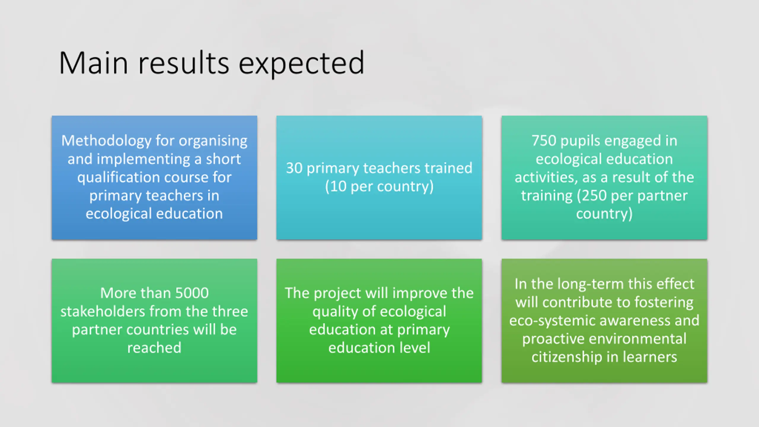 Main results expected Methodology for organising and implementing a short qualification course for primary teachers in ecological education 750 pupils engaged in ecological education activities, as a result of the training (250 per partner country) 30 primary teachers trained (10 per country) In the long-term this effect will contribute to fostering eco-systemic awareness and proactive environmental citizenship in learners More than 5000 stakeholders from the three partner countries will be reached The project will improve the quality of ecological education at primary education level