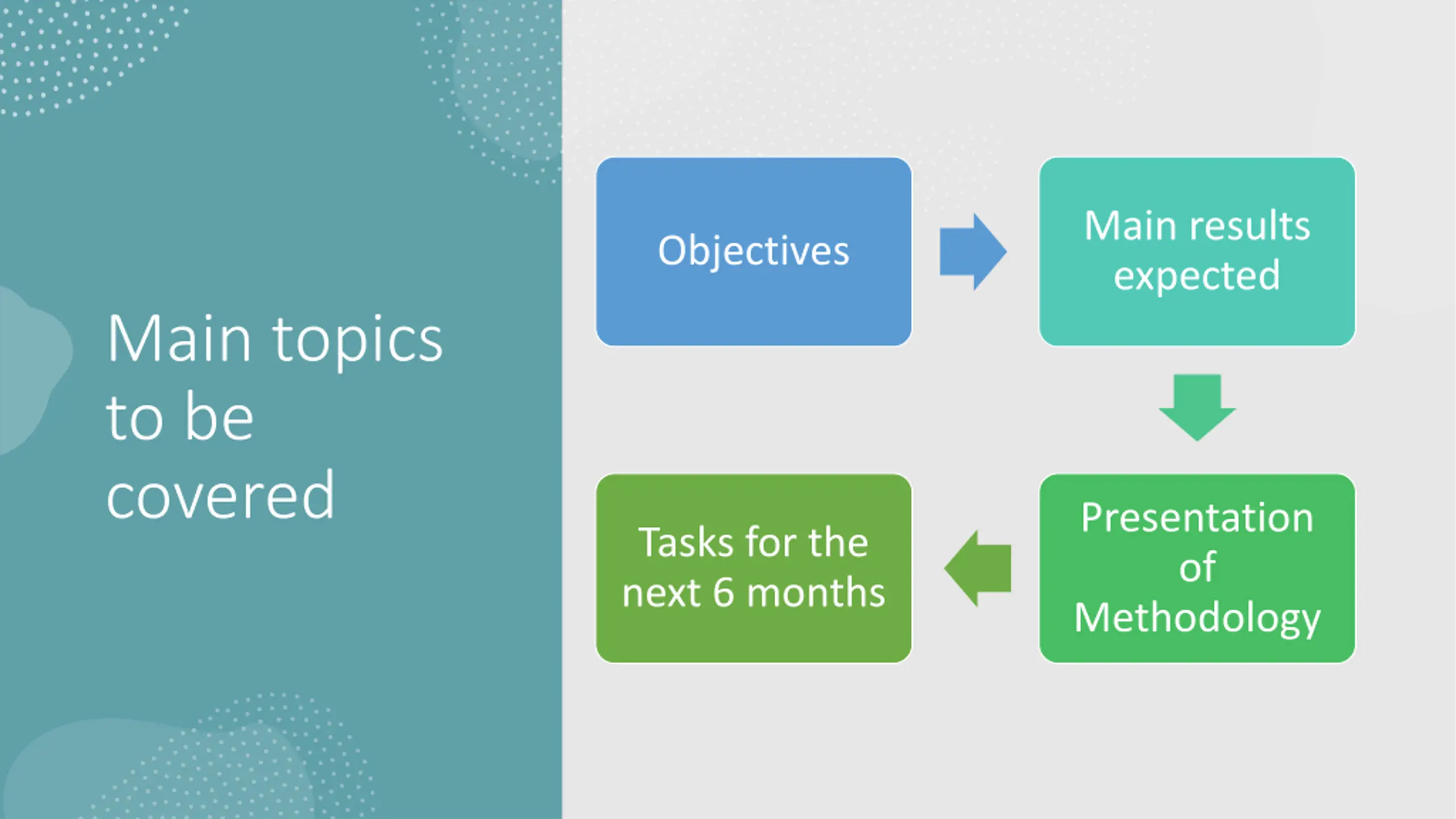 Main results expected Objectives Main topics to be covered Presentation of Methodology Tasks for the next 6 months
