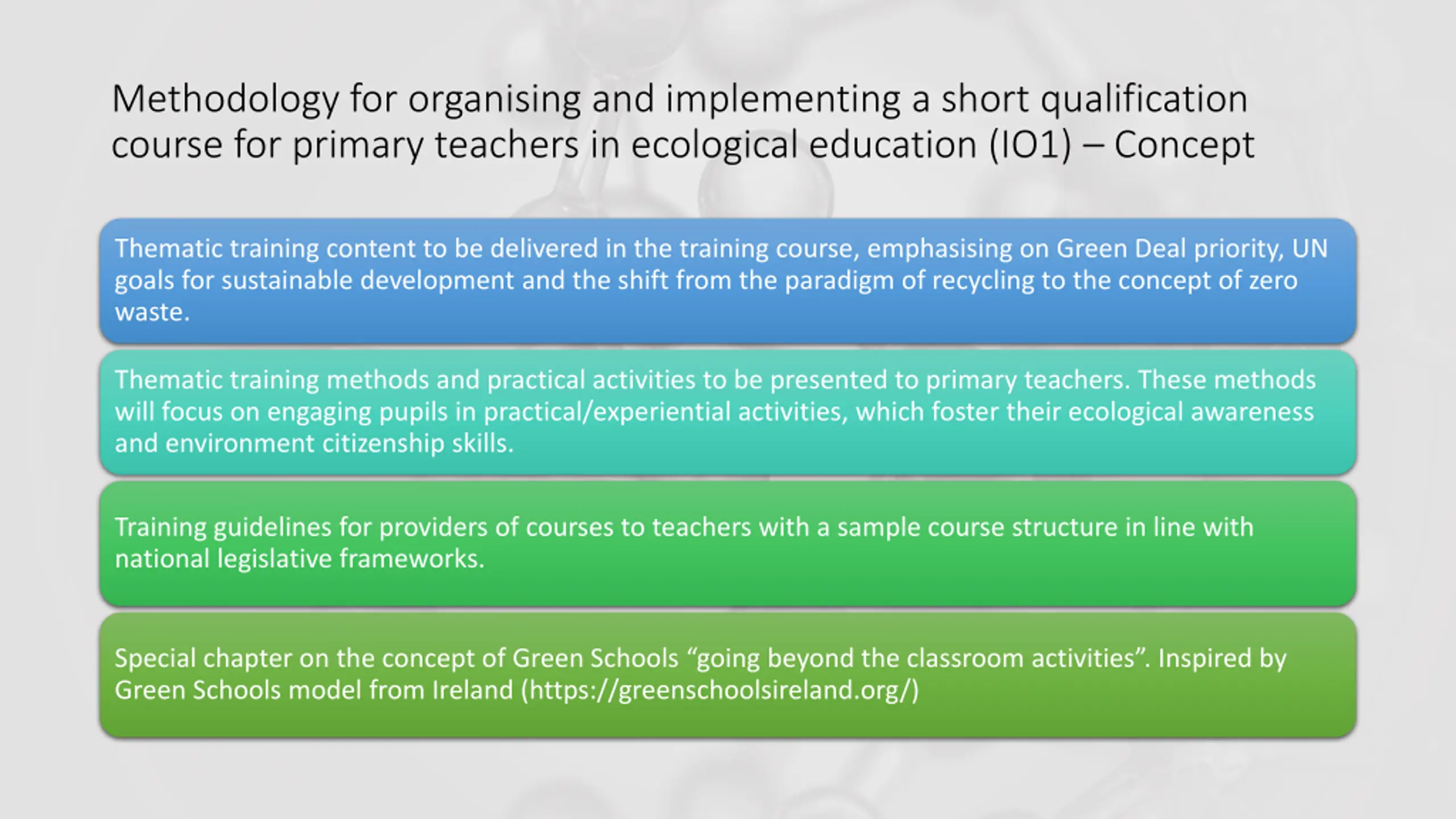 Methodology for organising and implementing a short qualification course for primary teachers in ecological education (IO1) Concept Thematic training content to be delivered in the training course, emphasising on Green Deal priority, UN goals for sustainable development and the shift from the paradigm of recycling to the concept of zero waste. Thematic training methods and practical activities to be presented to primary teachers. These methods will focus on engaging pupils in practical/experiential activities, which foster their ecological awareness and environment citizenship skills. Training guidelines for providers of courses to teachers with a sample course structure in line with national legislative frameworks. Special chapter on the concept of Green Schools going beyond the classroom activities . Inspired by Green Schools model from Ireland (https://greenschoolsireland.org/)