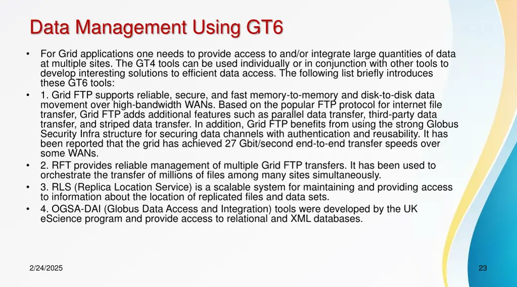 Data Management Using GT6 For Grid applications one needs to provide access to and/or integrate large quantities of data at multiple sites. The GT4 tools can be used individually or in conjunction with other tools to develop interesting solutions to efficient data access. The following list briefly introduces these GT6 tools: 1. Grid FTP supports reliable, secure, and fast memory-to-memory and disk-to-disk data movement over high-bandwidth WANs. Based on the popular FTP protocol for internet file transfer, Grid FTP adds additional features such as parallel data transfer, third-party data transfer, and striped data transfer. In addition, Grid FTP benefits from using the strong Globus Security Infra structure for securing data channels with authentication and reusability. It has been reported that the grid has achieved 27 Gbit/second end-to-end transfer speeds over some WANs. 2. RFT provides reliable management of multiple Grid FTP transfers. It has been used to orchestrate the transfer of millions of files among many sites simultaneously. 3. RLS (Replica Location Service) is a scalable system for maintaining and providing access to information about the location of replicated files and data sets. 4. OGSA-DAI (Globus Data Access and Integration) tools were developed by the UK eScience program and provide access to relational and XML databases. 2/24/2025 23