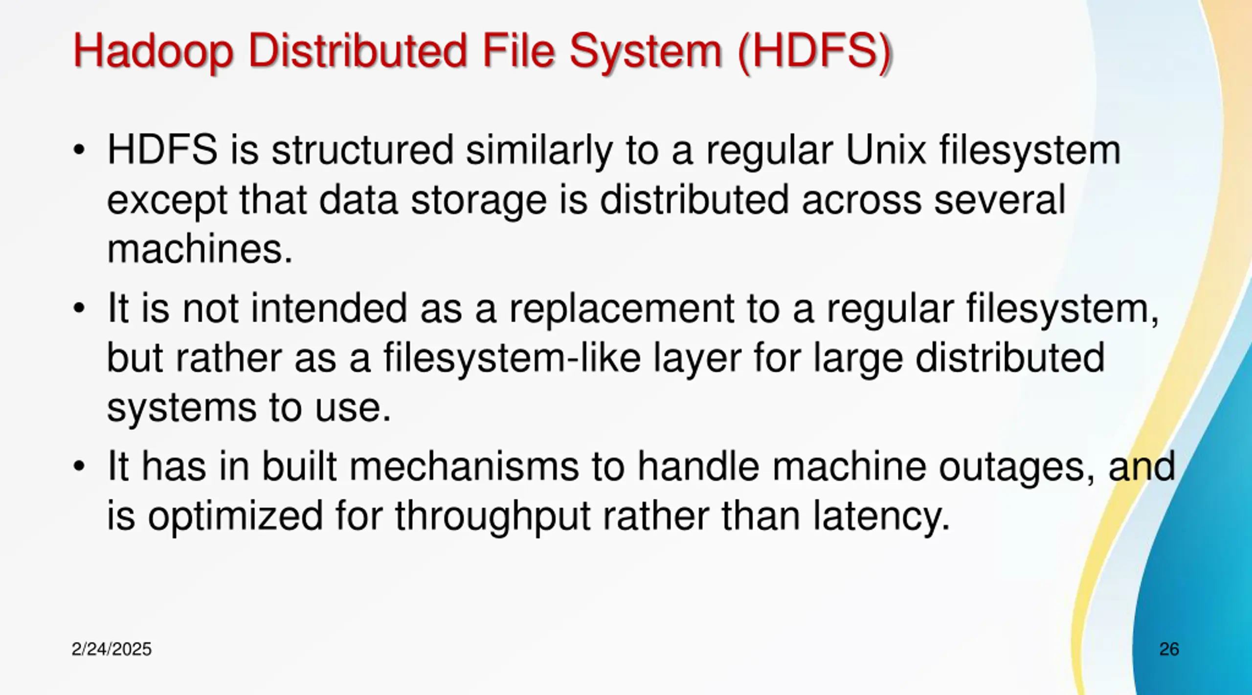 Hadoop Distributed File System (HDFS) HDFS is structured similarly to a regular Unix filesystem except that data storage is distributed across several machines. It is not intended as a replacement to a regular filesystem, but rather as a filesystem-like layer for large distributed systems to use. It has in built mechanisms to handle machine outages, and is optimized for throughput rather than latency. 2/24/2025 26