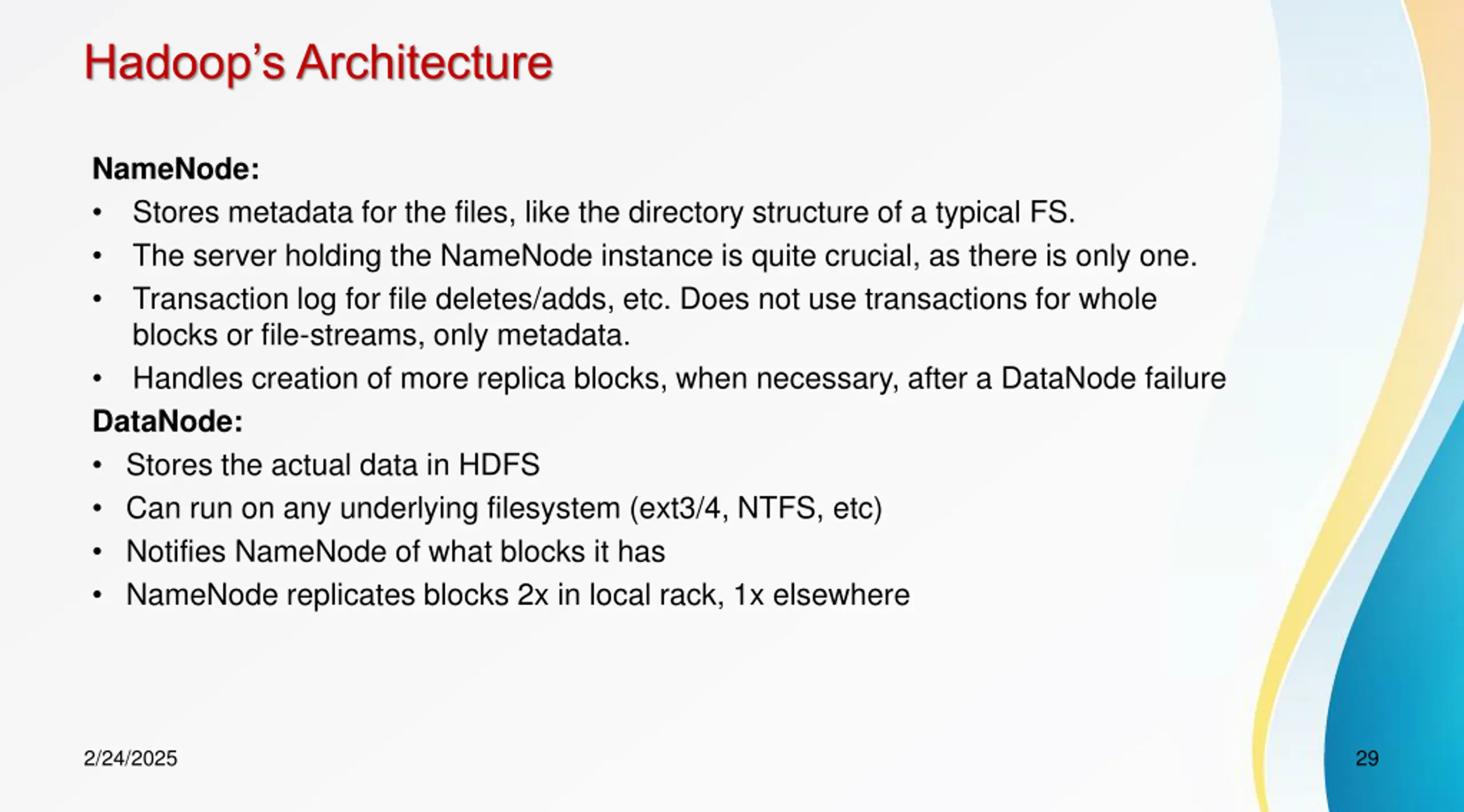 Hadoops Architecture NameNode: Stores metadata for the files, like the directory structure of a typical FS. The server holding the NameNode instance is quite crucial, as there is only one. Transaction log for file deletes/adds, etc. Does not use transactions for whole blocks or file-streams, only metadata. Handles creation of more replica blocks, when necessary, after a DataNode failure DataNode: Stores the actual data in HDFS Can run on any underlying filesystem (ext3/4, NTFS, etc) Notifies NameNode of what blocks it has NameNode replicates blocks 2x in local rack, 1x elsewhere 2/24/2025 29