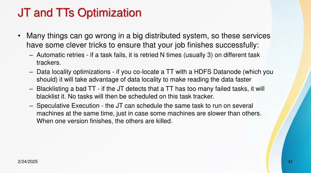 JT and TTs Optimization Many things can go wrong in a big distributed system, so these services have some clever tricks to ensure that your job finishes successfully: Automatic retries - if a task fails, it is retried N times (usually 3) on different task trackers. Data locality optimizations - if you co-locate a TT with a HDFS Datanode (which you should) it will take advantage of data locality to make reading the data faster Blacklisting a bad TT - if the JT detects that a TT has too many failed tasks, it will blacklist it. No tasks will then be scheduled on this task tracker. Speculative Execution - the JT can schedule the same task to run on several machines at the same time, just in case some machines are slower than others. When one version finishes, the others are killed. 2/24/2025 41