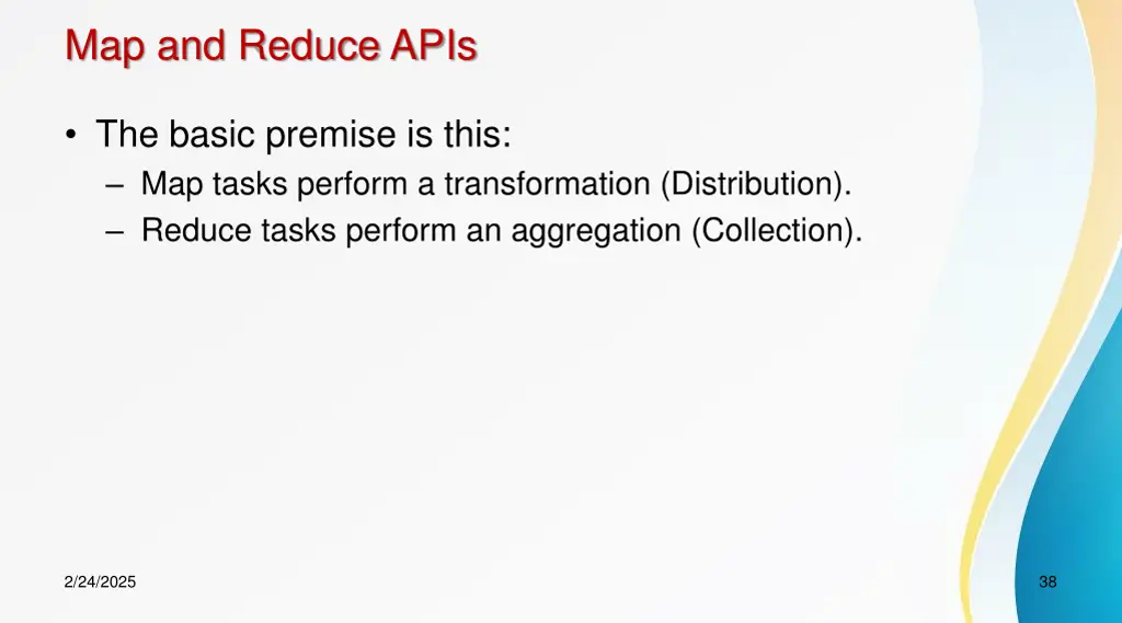 Map and Reduce APIs The basic premise is this: Map tasks perform a transformation (Distribution). Reduce tasks perform an aggregation (Collection). 2/24/2025 38