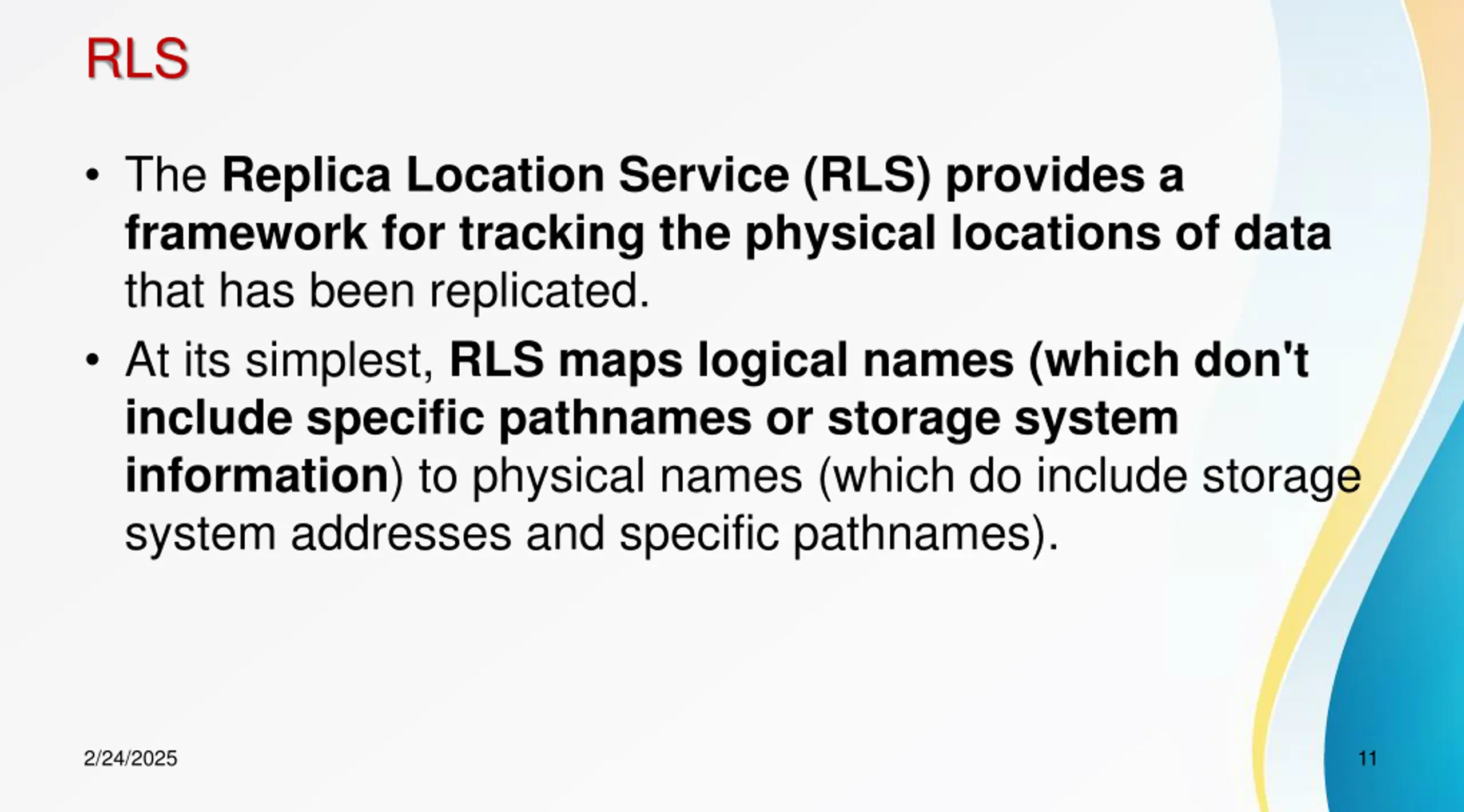 RLS The Replica Location Service (RLS) provides a framework for tracking the physical locations of data that has been replicated. At its simplest, RLS maps logical names (which don't include specific pathnames or storage system information) to physical names (which do include storage system addresses and specific pathnames). 2/24/2025 11