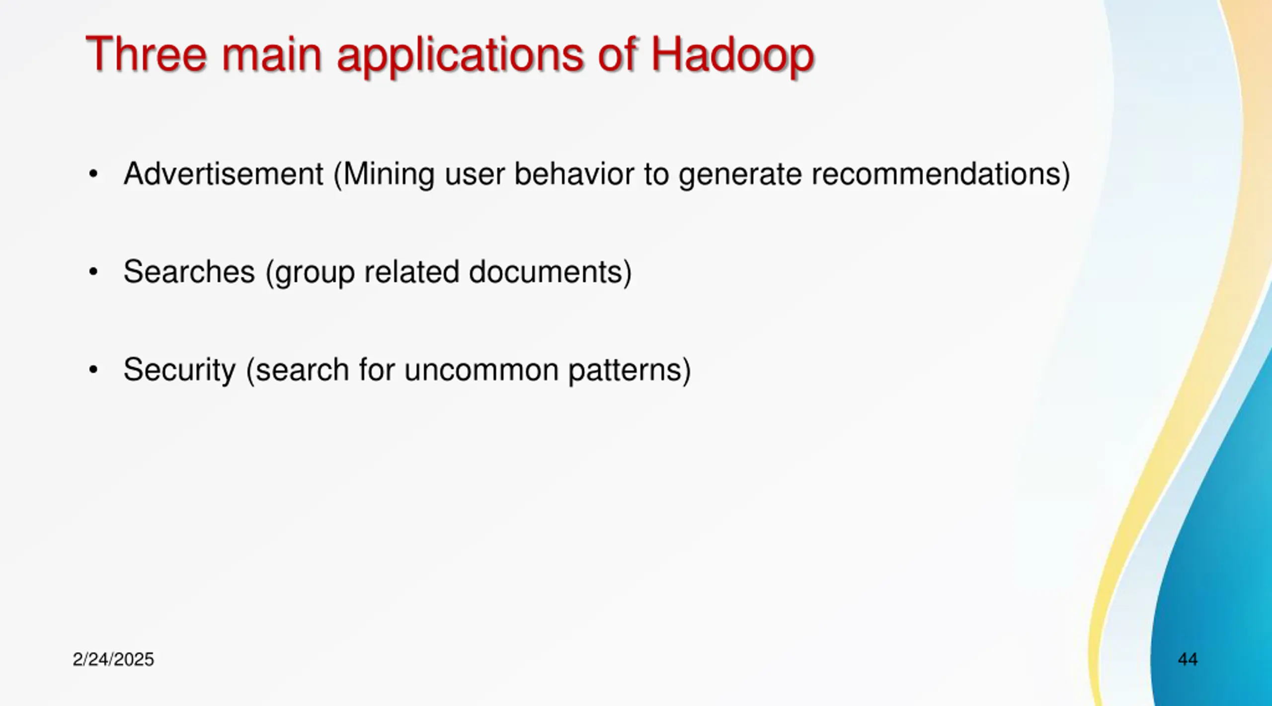 Three main applications of Hadoop Advertisement (Mining user behavior to generate recommendations) Searches (group related documents) Security (search for uncommon patterns) 2/24/2025 44