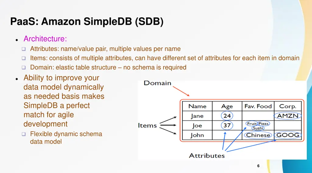 PaaS: Amazon SimpleDB (SDB) Developers want to: Store data Process data Query data Probably don t want: Schema management Index management Performance tuning Data access scaling All data is replicated in geographically disbursed data centers (no explicit backup). Requests use HTTPS (security) Complex JOIN applications (DW) are not a good match for SimpleDB 5