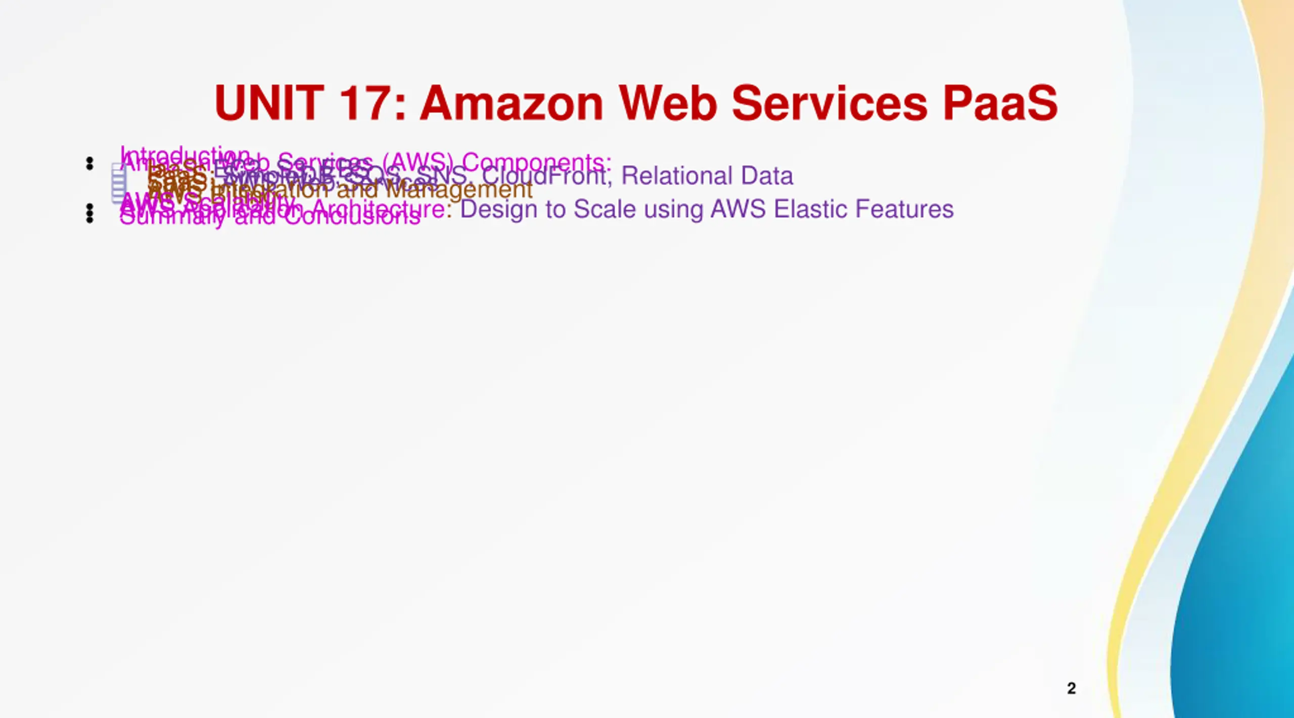 UNIT 17: Amazon Web Services PaaS Introduction Amazon Web Services (AWS) Components: IaaS: EC2, S3, EBS PaaS: SimpleDB, SQS, SNS, CloudFront, Relational Data SaaS: AWS Web Services AWS Integration and Management AWS Billing AWS Scalability AWS Application Architecture: Design to Scale using AWS Elastic Features Summary and Conclusions 2