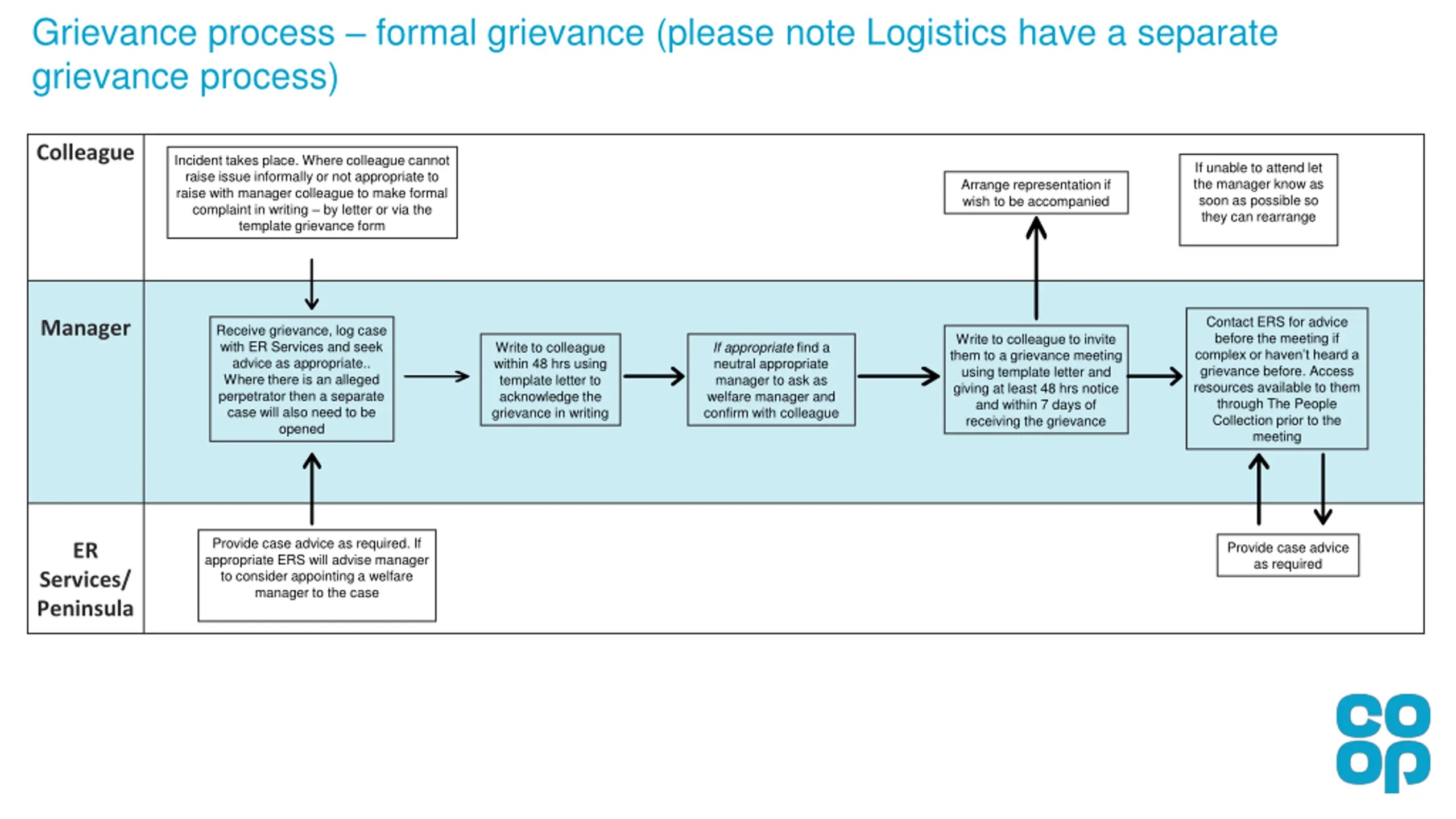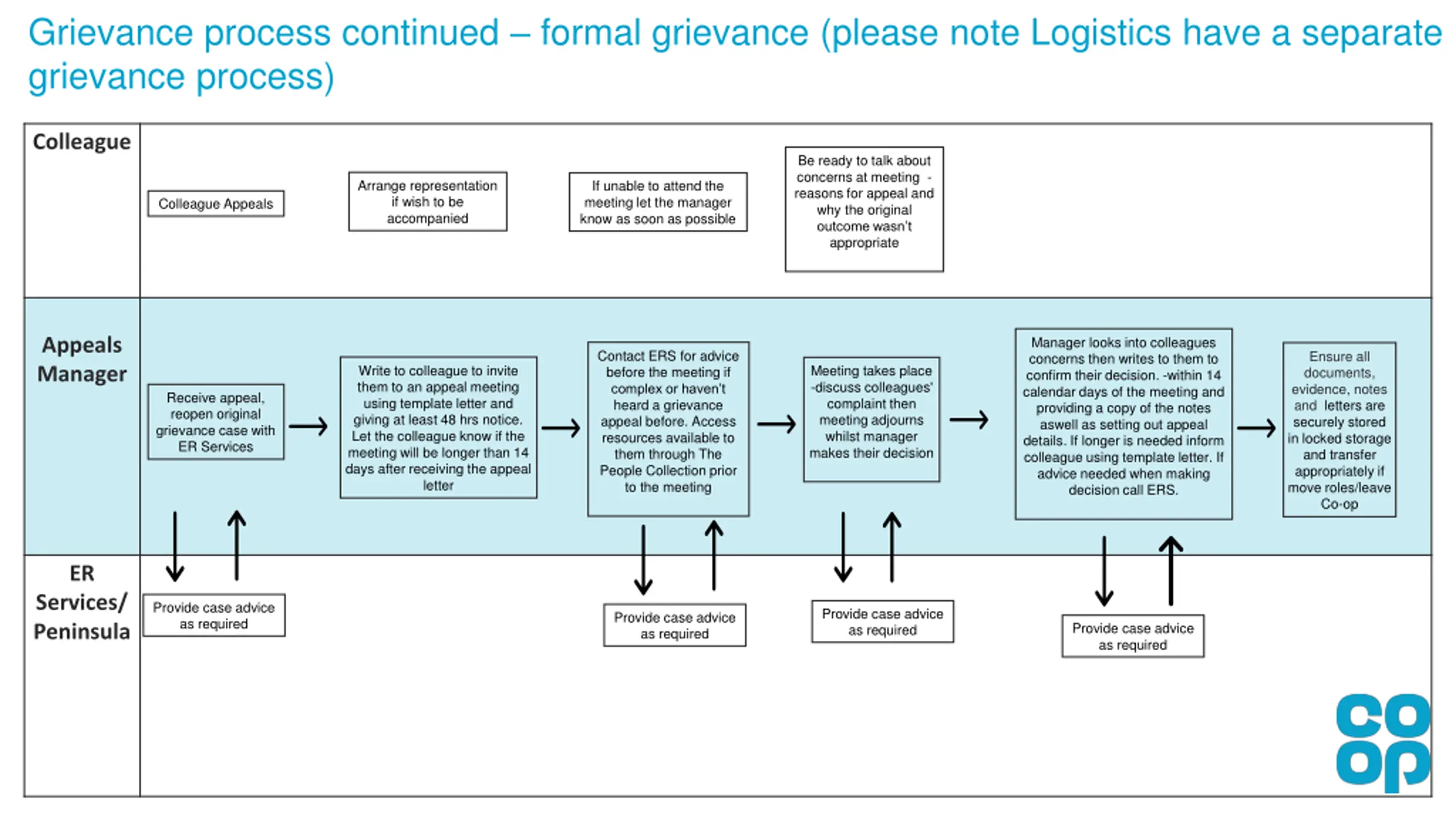 Grievance process continued formal grievance (please note Logistics have a separate grievance process) Colleague Be ready to talk about concerns at meeting - reasons for appeal and why the original outcome wasn t appropriate Arrange representation if wish to be accompanied If unable to attend the meeting let the manager know as soon as possible Colleague Appeals Appeals Manager Manager looks into colleagues concerns then writes to them to confirm their decision. -within 14 calendar days of the meeting and providing a copy of the notes aswell as setting out appeal details. If longer is needed inform colleague using template letter. If advice needed when making decision call ERS. Contact ERS for advice before the meeting if complex or haven t heard a grievance appeal before. Access resources available to them through The People Collection prior to the meeting Ensure all documents, evidence, notes and letters are securely stored in locked storage and transfer appropriately if move roles/leave Co-op Write to colleague to invite them to an appeal meeting using template letter and giving at least 48 hrs notice. Let the colleague know if the meeting will be longer than 14 days after receiving the appeal letter Meeting takes place -discuss colleagues' complaint then meeting adjourns whilst manager makes their decision Receive appeal, reopen original grievance case with ER Services ER Services/ Peninsula Provide case advice as required Provide case advice as required Provide case advice as required Provide case advice as required