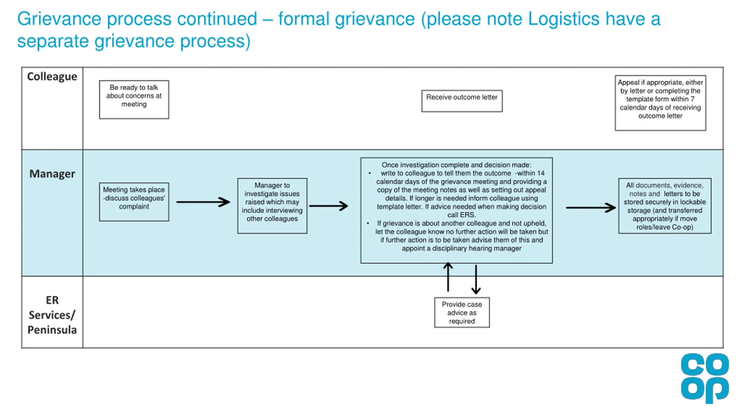 Grievance process continued formal grievance (please note Logistics have a separate grievance process) Colleague Appeal if appropriate, either by letter or completing the template form within 7 calendar days of receiving outcome letter Be ready to talk about concerns at meeting Receive outcome letter Once investigation complete and decision made: write to colleague to tell them the outcome -within 14 calendar days of the grievance meeting and providing a copy of the meeting notes as well as setting out appeal details. If longer is needed inform colleague using template letter. If advice needed when making decision call ERS. If grievance is about another colleague and not upheld, let the colleague know no further action will be taken but if further action is to be taken advise them of this and appoint a disciplinary hearing manager Manager Manager to investigate issues raised which may include interviewing other colleagues All documents, evidence, notes and letters to be stored securely in lockable storage (and transferred appropriately if move roles/leave Co-op) Meeting takes place -discuss colleagues' complaint ER Provide case advice as required Services/ Peninsula