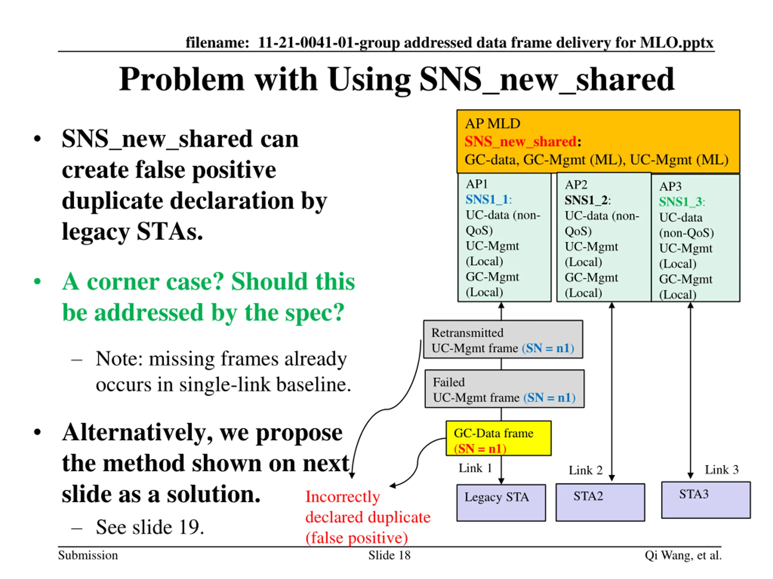 filename: 11-21-0041-01-group addressed data frame delivery for MLO.pptx Problem with Using SNS_new_shared AP MLD SNS_new_shared: GC-data, GC-Mgmt (ML), UC-Mgmt (ML) SNS_new_shared can create false positive duplicate declaration by legacy STAs. AP1 SNS1_1: UC-data (non- QoS) UC-Mgmt (Local) GC-Mgmt (Local) AP2 SNS1_2: UC-data (non- QoS) UC-Mgmt (Local) GC-Mgmt (Local) AP3 SNS1_3: UC-data (non-QoS) UC-Mgmt (Local) GC-Mgmt (Local) A corner case? Should this be addressed by the spec? Retransmitted UC-Mgmt frame (SN = n1) Note: missing frames already occurs in single-link baseline. Failed UC-Mgmt frame (SN = n1) Alternatively, we propose the method shown on next slide as a solution. See slide 19. GC-Data frame (SN = n1) Link 1 Link 3 Link 2 Incorrectly declared duplicate (false positive) STA3 STA2 Legacy STA Submission Slide 18 Qi Wang, et al.