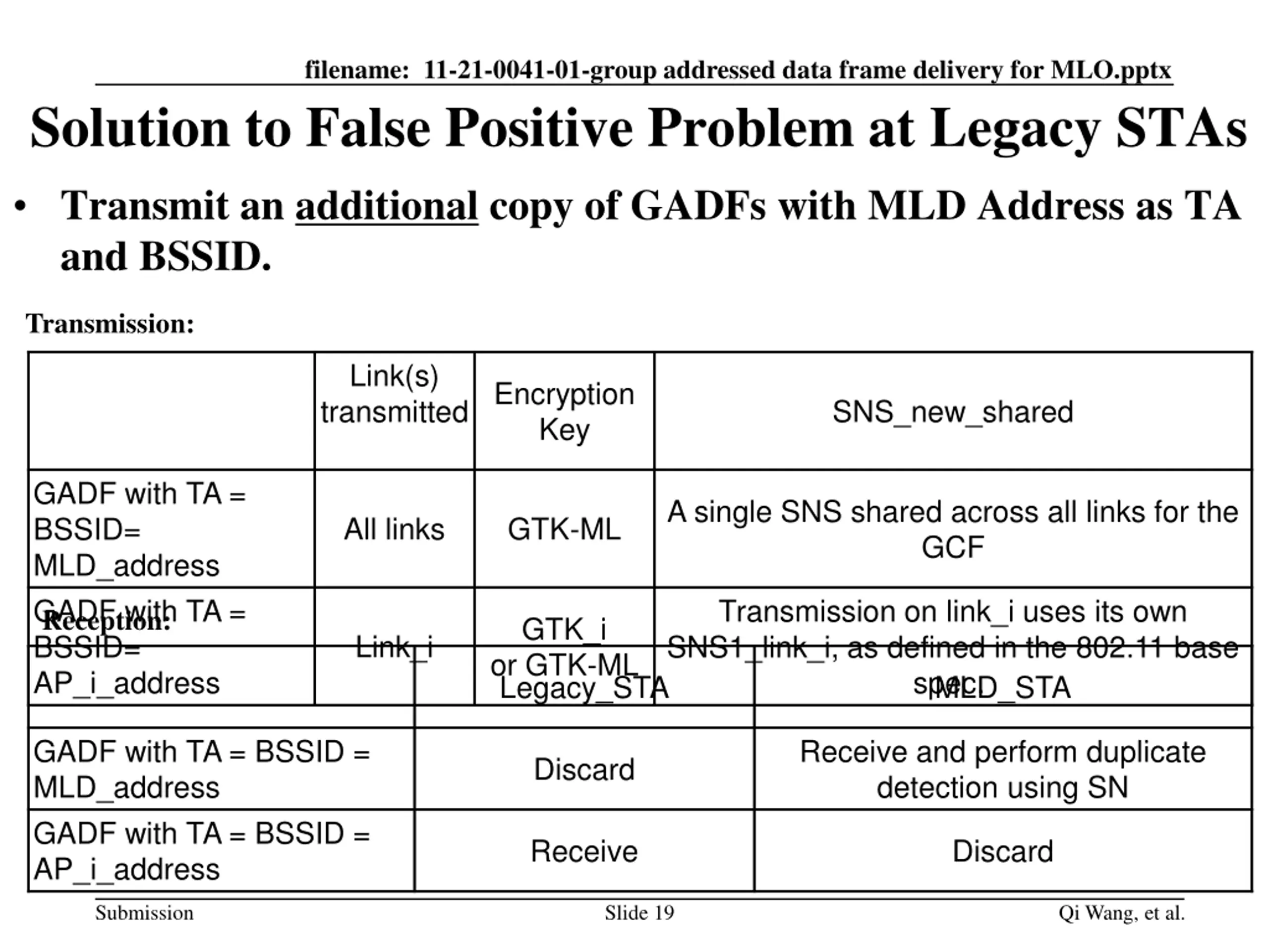 filename: 11-21-0041-01-group addressed data frame delivery for MLO.pptx Solution to False Positive Problem at Legacy STAs Transmit an additional copy of GADFs with MLD Address as TA and BSSID. Transmission: Link(s) transmitted Encryption Key SNS_new_shared GADF with TA = BSSID= MLD_address GADF with TA = BSSID= AP_i_address A single SNS shared across all links for the GCF All links GTK-ML Transmission on link_i uses its own SNS1_link_i, as defined in the 802.11 base spec. MLD_STA Reception: GTK_i or GTK-ML Legacy_STA Link_i GADF with TA = BSSID = MLD_address GADF with TA = BSSID = AP_i_address Receive and perform duplicate detection using SN Discard Receive Discard Submission Slide 19 Qi Wang, et al.