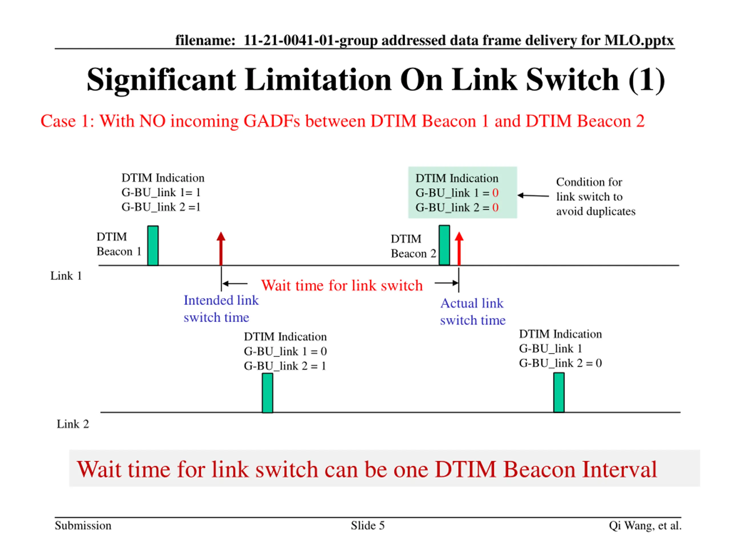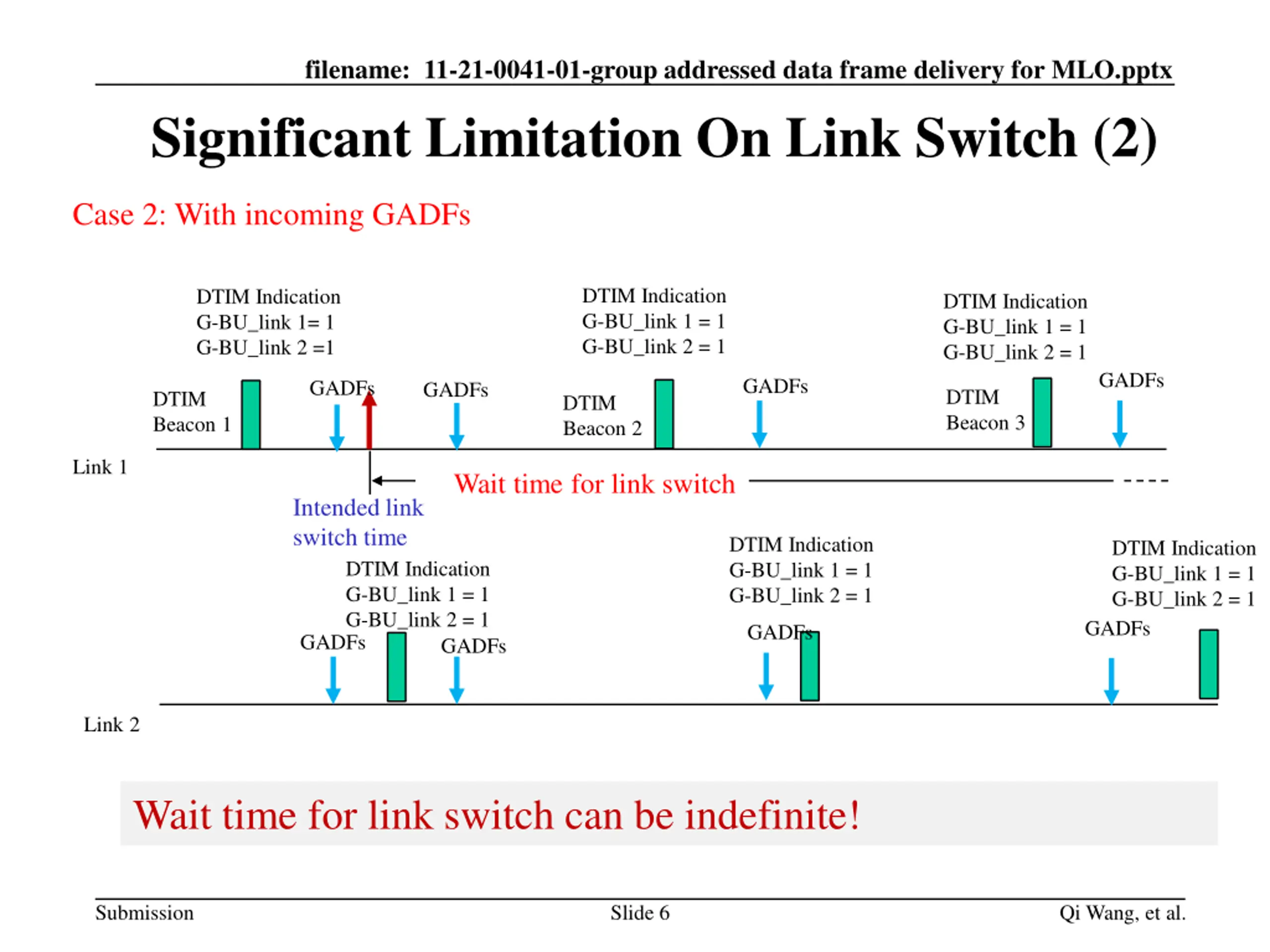 filename: 11-21-0041-01-group addressed data frame delivery for MLO.pptx Significant Limitation On Link Switch (2) Case 2: With incoming GADFs DTIM Indication G-BU_link 1 = 1 G-BU_link 2 = 1 DTIM Indication G-BU_link 1= 1 G-BU_link 2 =1 DTIM Indication G-BU_link 1 = 1 G-BU_link 2 = 1 GADFs GADFs GADFs GADFs DTIM Beacon 3 DTIM Beacon 1 DTIM Beacon 2 Link 1 Wait time for link switch Intended link switch time DTIM Indication G-BU_link 1 = 1 G-BU_link 2 = 1 GADFs DTIM Indication G-BU_link 1 = 1 G-BU_link 2 = 1 DTIM Indication G-BU_link 1 = 1 G-BU_link 2 = 1 GADFs GADFs GADFs Link 2 Wait time for link switch can be indefinite! Submission Slide 6 Qi Wang, et al.