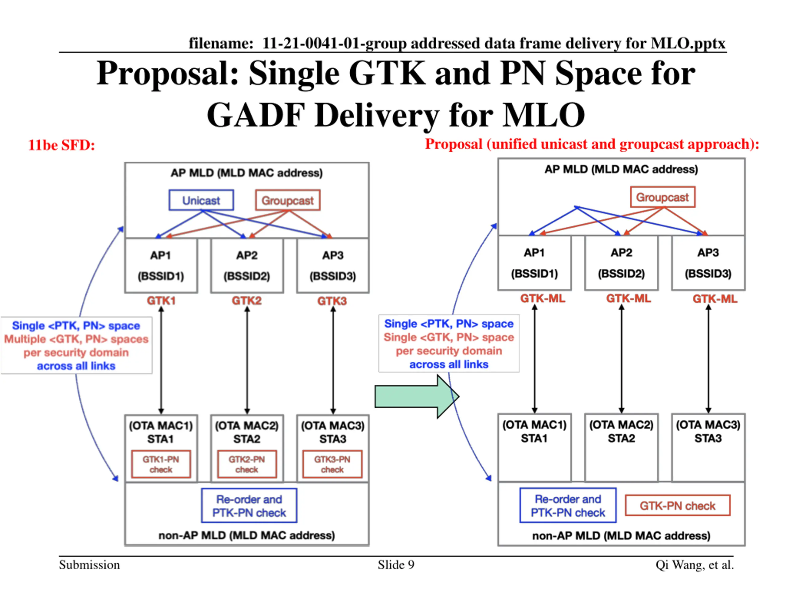 filename: 11-21-0041-01-group addressed data frame delivery for MLO.pptx Proposal: Single GTK and PN Space for GADF Delivery for MLO 11be SFD: Proposal (unified unicast and groupcast approach): Submission Slide 9 Qi Wang, et al.