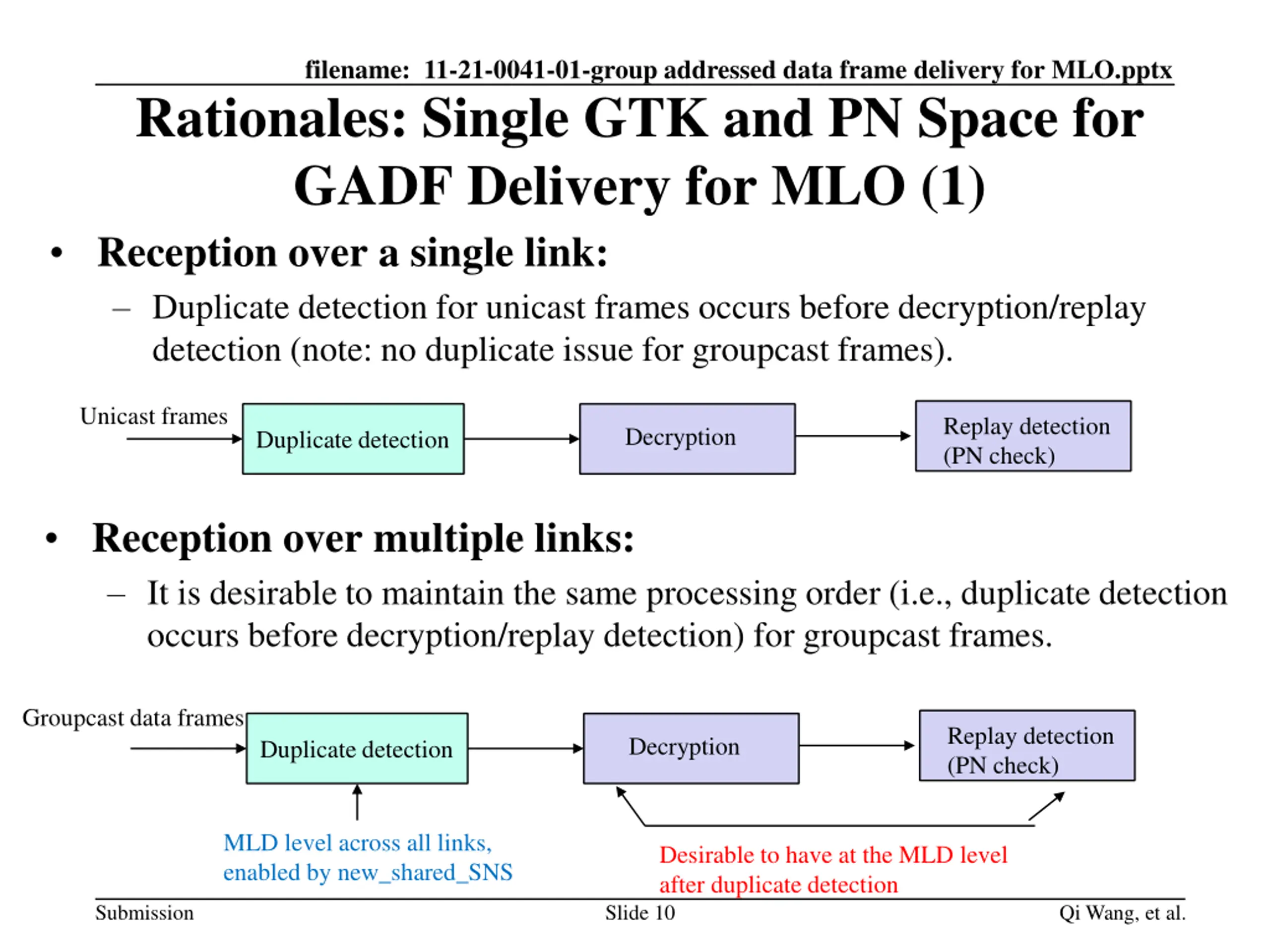 filename: 11-21-0041-01-group addressed data frame delivery for MLO.pptx Overview Per 11be SFD [1], group addressed data frames (GADFs) are transmitted independently over multiple links of MLD, and a non-AP MLD needs to select one link to receive GADFs. As a result, a non-AP MLD can receive undetectable duplicated GADFs when switching link for GADF reception. We propose group addressed data frame delivery methods to enable duplicate detection . We also propose to use a single GTK, PN space per security domain for group addressed data frame delivery for MLO. Submission Slide 2 Qi Wang, et al.