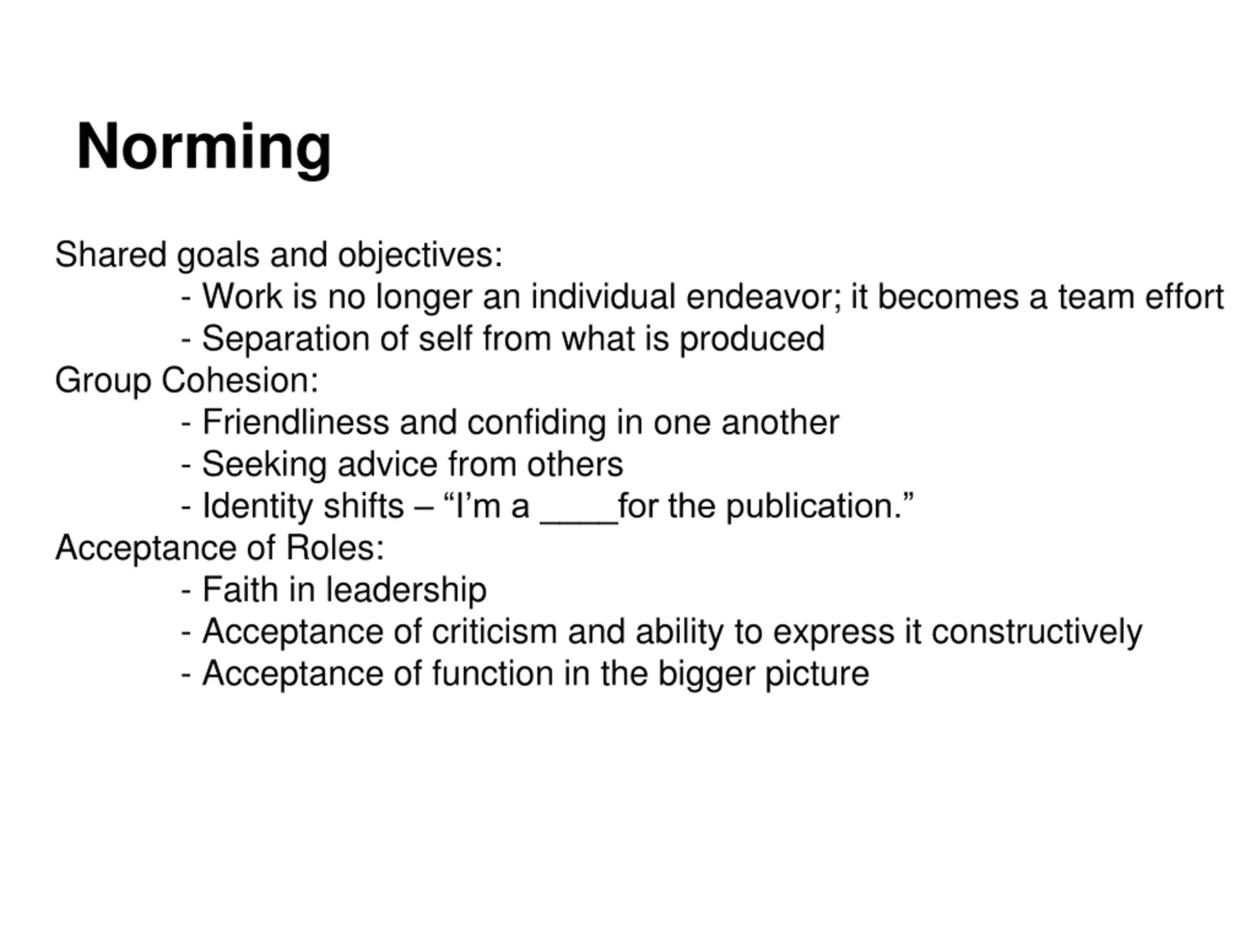 Norming Shared goals and objectives: - Work is no longer an individual endeavor; it becomes a team effort - Separation of self from what is produced Group Cohesion: - Friendliness and confiding in one another - Seeking advice from others - Identity shifts I m a ____for the publication. Acceptance of Roles: - Faith in leadership - Acceptance of criticism and ability to express it constructively - Acceptance of function in the bigger picture