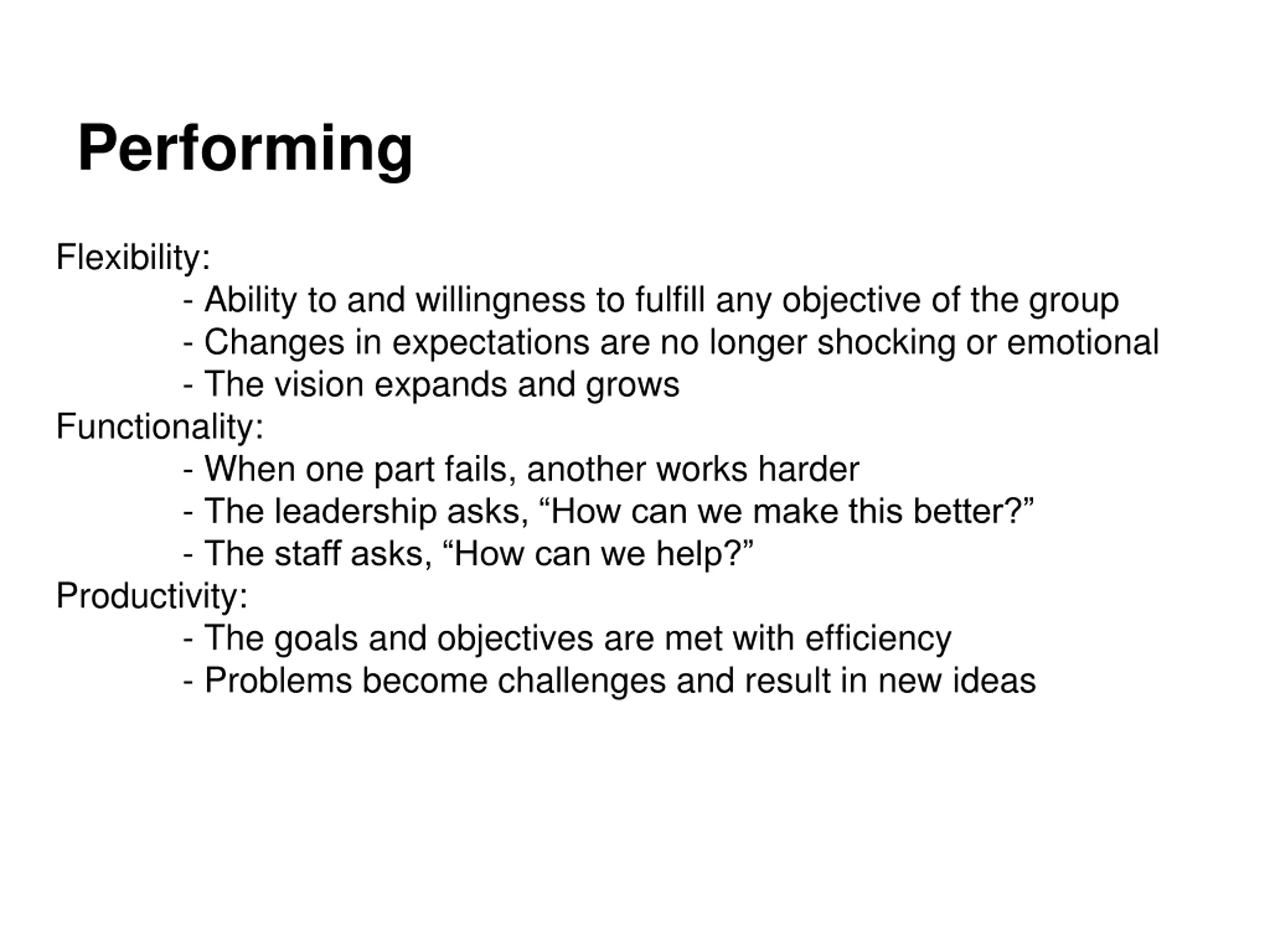 Performing Flexibility: - Ability to and willingness to fulfill any objective of the group - Changes in expectations are no longer shocking or emotional - The vision expands and grows Functionality: - When one part fails, another works harder - The leadership asks, How can we make this better? - The staff asks, How can we help? Productivity: - The goals and objectives are met with efficiency - Problems become challenges and result in new ideas