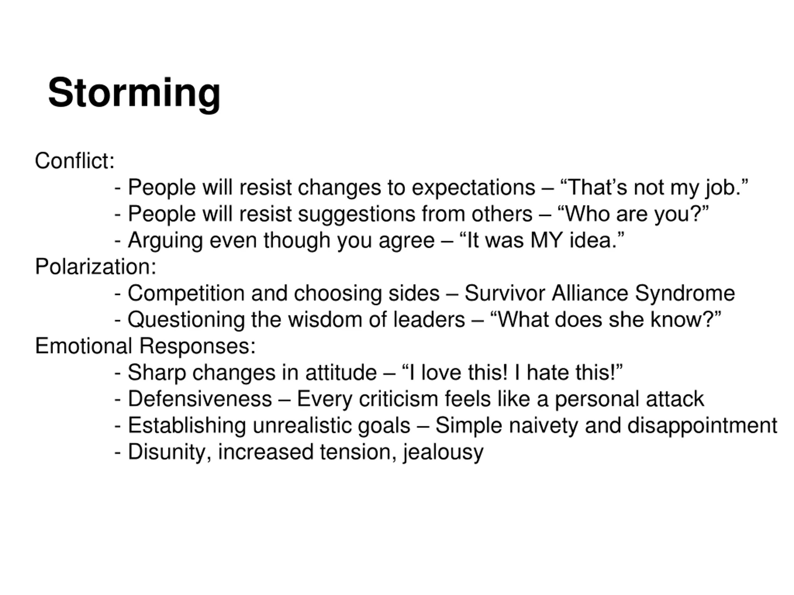 Storming Conflict: - People will resist changes to expectations That s not my job. - People will resist suggestions from others Who are you? - Arguing even though you agree It was MY idea. Polarization: - Competition and choosing sides Survivor Alliance Syndrome - Questioning the wisdom of leaders What does she know? Emotional Responses: - Sharp changes in attitude I love this! I hate this! - Defensiveness Every criticism feels like a personal attack - Establishing unrealistic goals Simple naivety and disappointment - Disunity, increased tension, jealousy