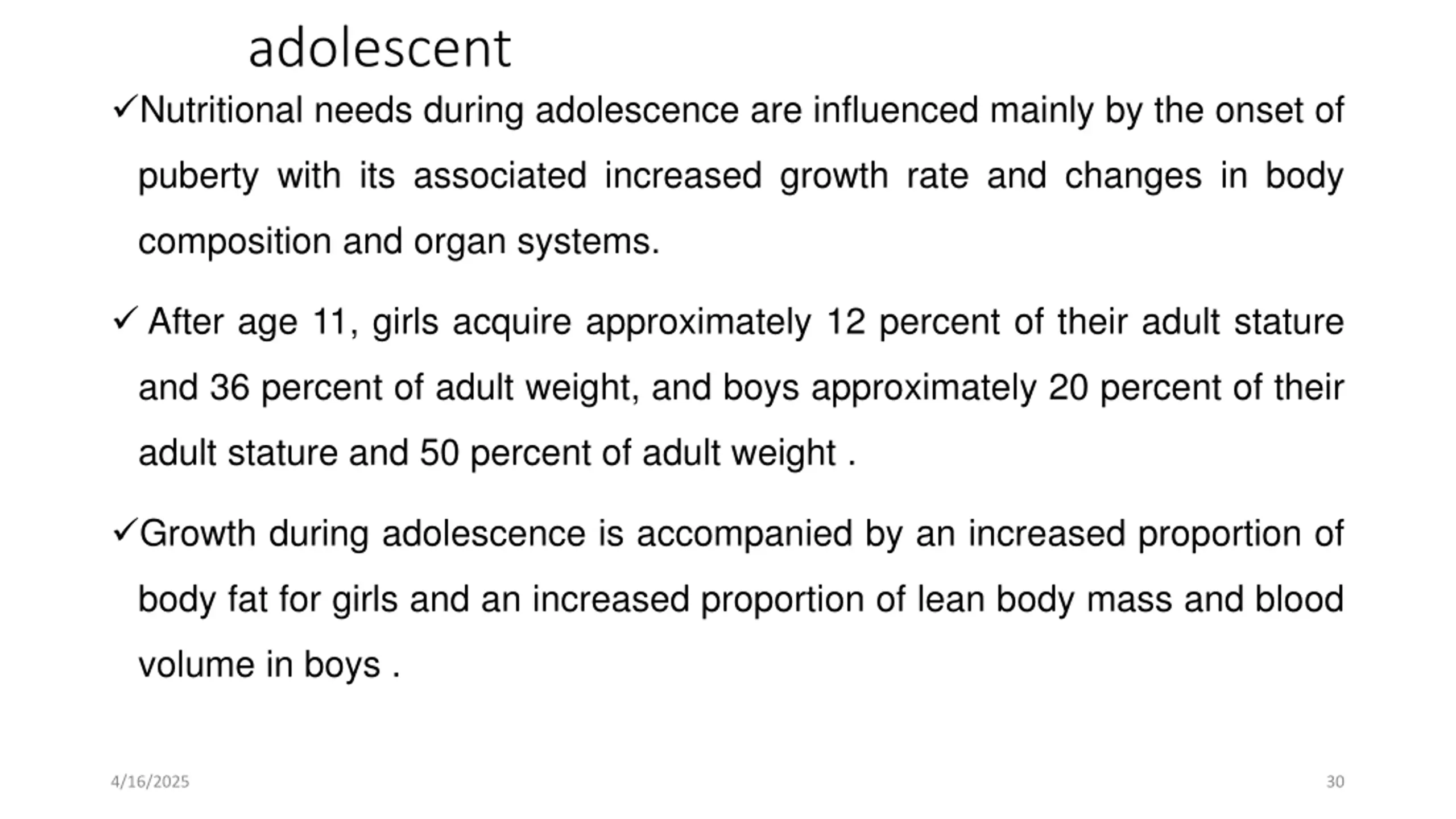 adolescent Nutritional needs during adolescence are influenced mainly by the onset of puberty with its associated increased growth rate and changes in body composition and organ systems. After age 11, girls acquire approximately 12 percent of their adult stature and 36 percent of adult weight, and boys approximately 20 percent of their adult stature and 50 percent of adult weight . Growth during adolescence is accompanied by an increased proportion of body fat for girls and an increased proportion of lean body mass and blood volume in boys . 4/16/2025 30