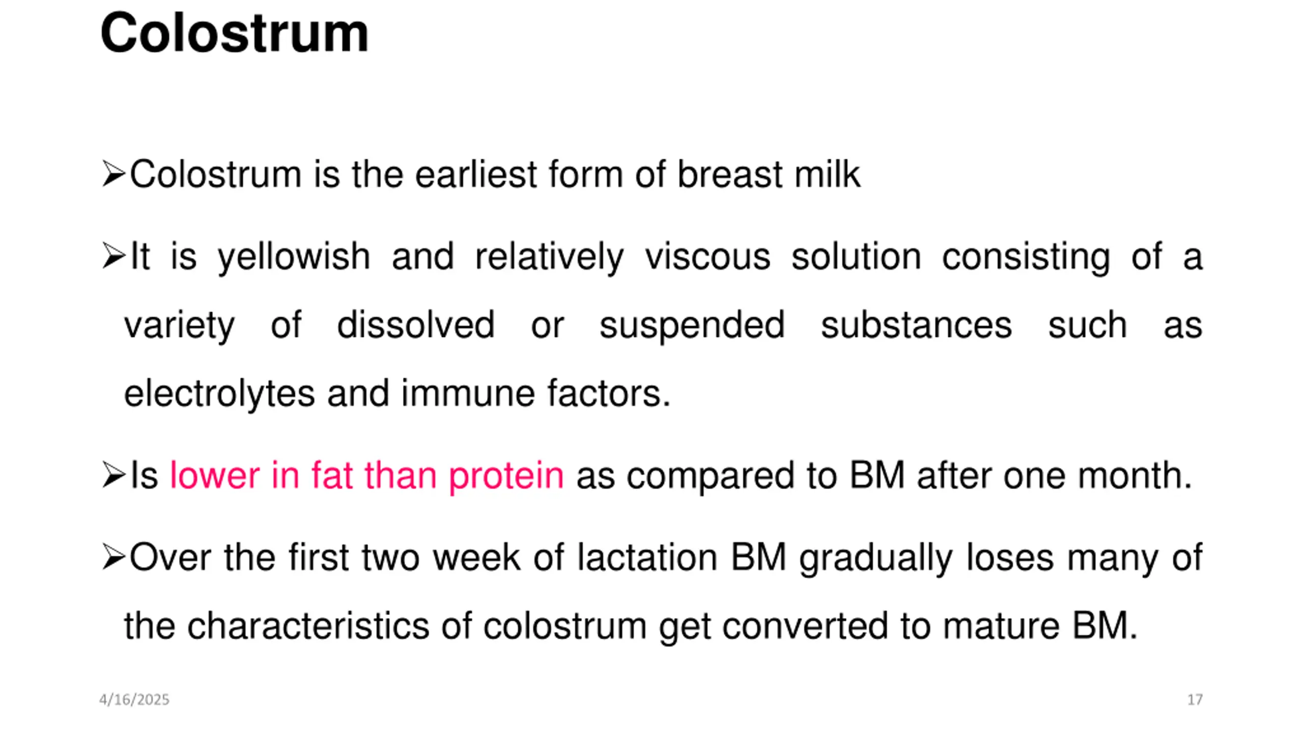 Colostrum Colostrum is the earliest form of breast milk It is yellowish and relatively viscous solution consisting of a variety of dissolved or suspended substances such as electrolytes and immune factors. Is lower in fat than protein as compared to BM after one month. Over the first two week of lactation BM gradually loses many of the characteristics of colostrum get converted to mature BM. 4/16/2025 17
