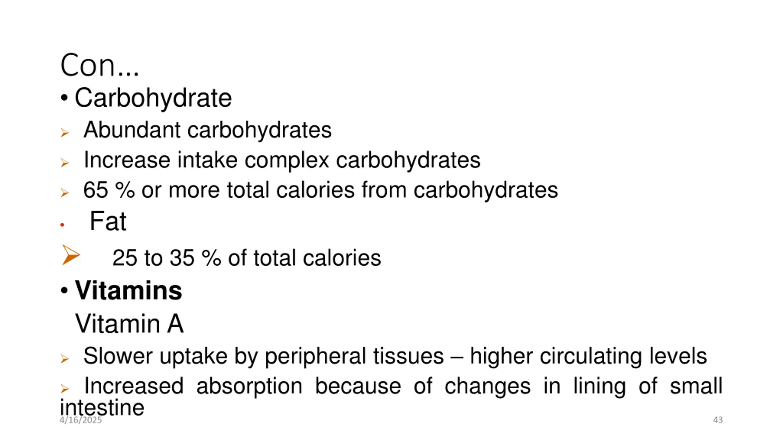 Con Carbohydrate Abundant carbohydrates Increase intake complex carbohydrates 65 % or more total calories from carbohydrates Fat 25 to 35 % of total calories Vitamins Vitamin A Slower uptake by peripheral tissues higher circulating levels Increased absorption because of changes in lining of small intestine 4/16/2025 43