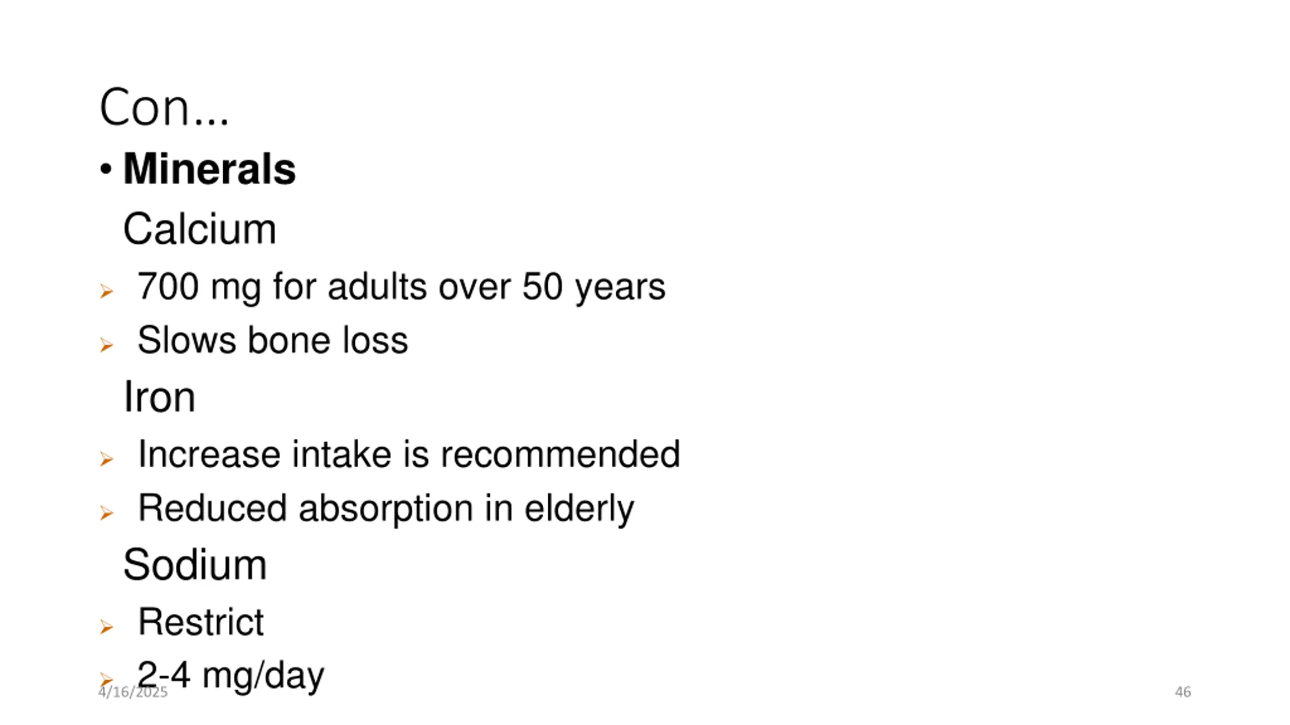Con Minerals Calcium 700 mg for adults over 50 years Slows bone loss Iron Increase intake is recommended Reduced absorption in elderly Sodium Restrict 2-4 mg/day 4/16/2025 46