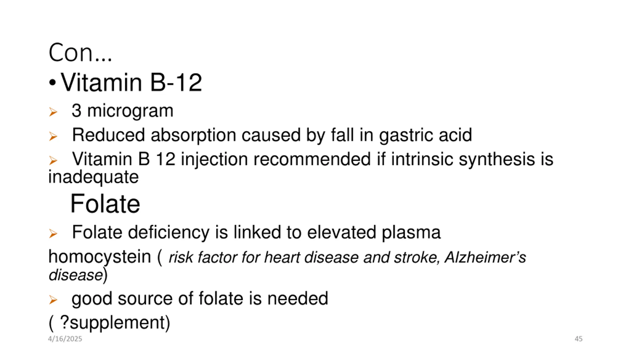 Con Vitamin B-12 3 microgram Reduced absorption caused by fall in gastric acid Vitamin B 12 injection recommended if intrinsic synthesis is inadequate Folate Folate deficiency is linked to elevated plasma homocystein ( risk factor for heart disease and stroke, Alzheimer s disease) good source of folate is needed ( ?supplement) 4/16/2025 45