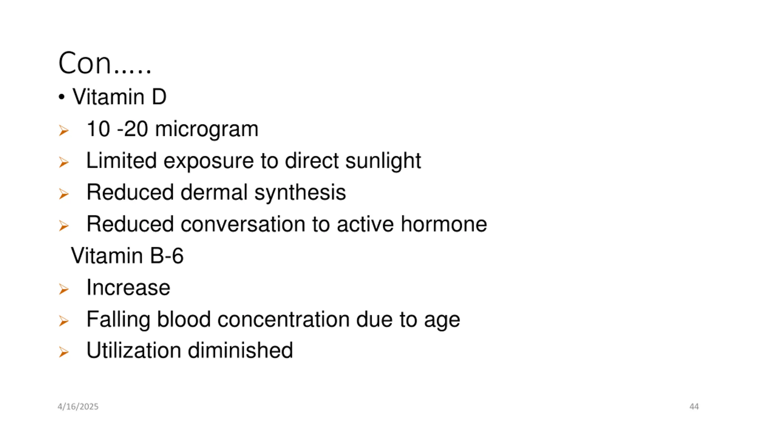 Con.. Vitamin D 10 -20 microgram Limited exposure to direct sunlight Reduced dermal synthesis Reduced conversation to active hormone Vitamin B-6 Increase Falling blood concentration due to age Utilization diminished 4/16/2025 44