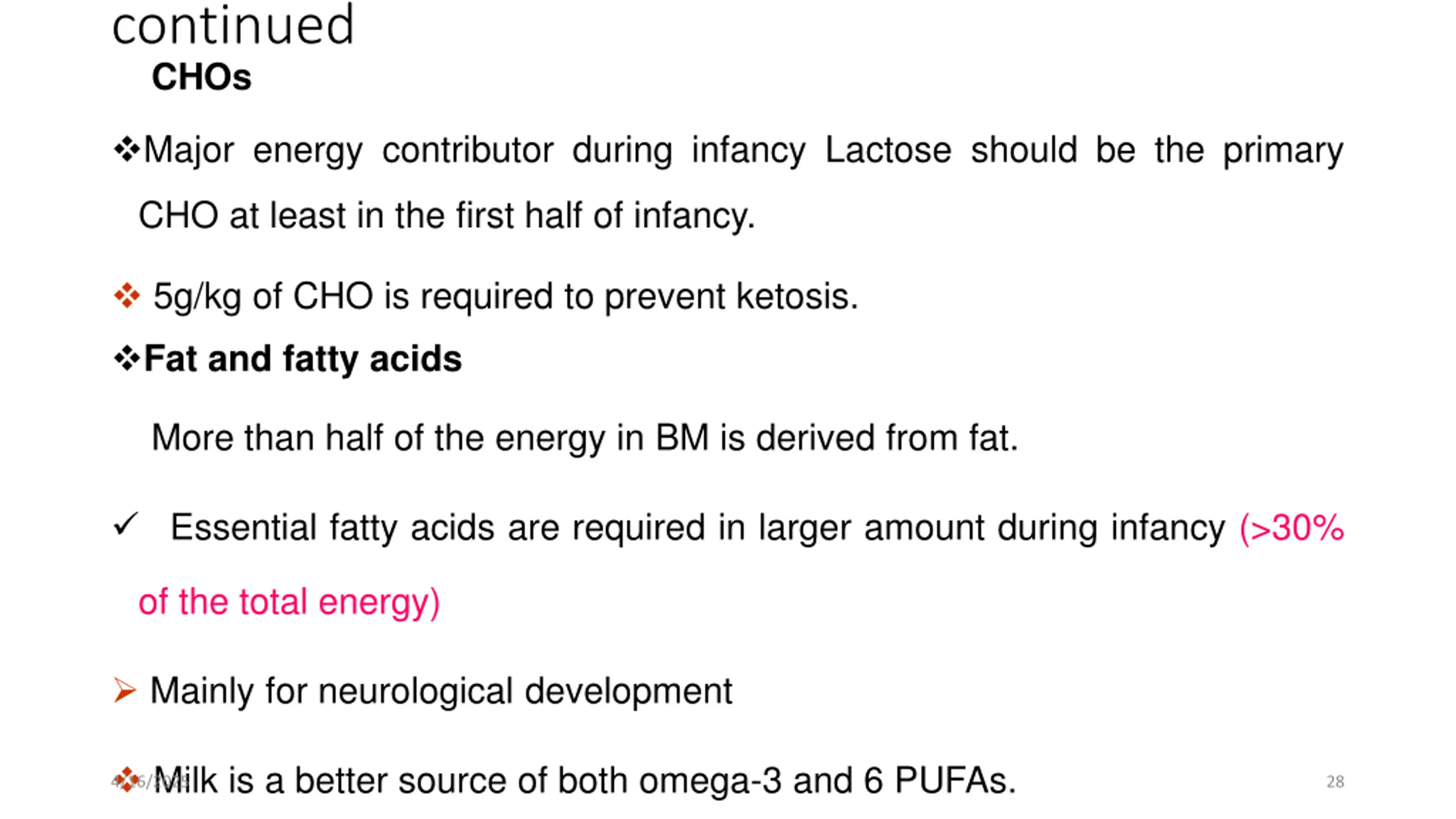 continued CHOs Major energy contributor during infancy Lactose should be the primary CHO at least in the first half of infancy. 5g/kg of CHO is required to prevent ketosis. Fat and fatty acids More than half of the energy in BM is derived from fat. Essential fatty acids are required in larger amount during infancy (>30% of the total energy) Mainly for neurological development Milk is a better source of both omega-3 and 6 PUFAs. 4/16/2025 28
