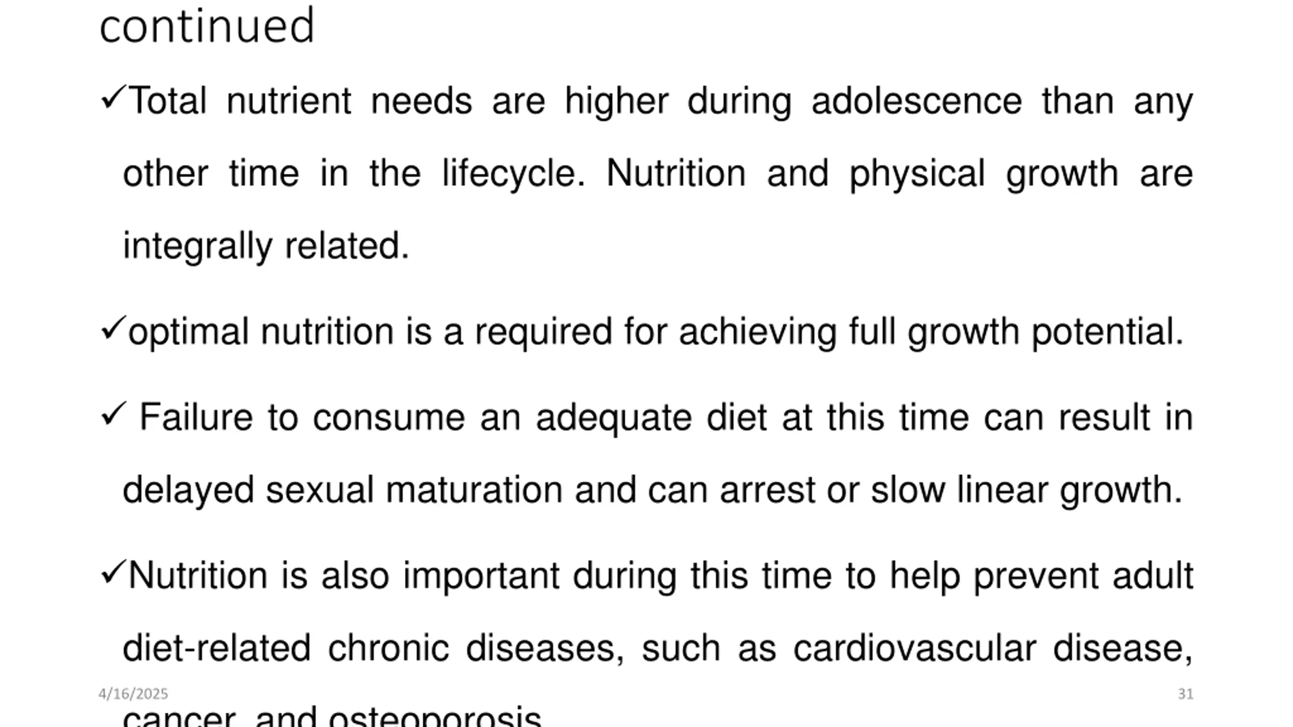 continued Total nutrient needs are higher during adolescence than any other time in the lifecycle. Nutrition and physical growth are integrally related. optimal nutrition is a required for achieving full growth potential. Failure to consume an adequate diet at this time can result in delayed sexual maturation and can arrest or slow linear growth. Nutrition is also important during this time to help prevent adult diet-related chronic diseases, such as cardiovascular disease, 4/16/2025 31 cancer, and osteoporosis