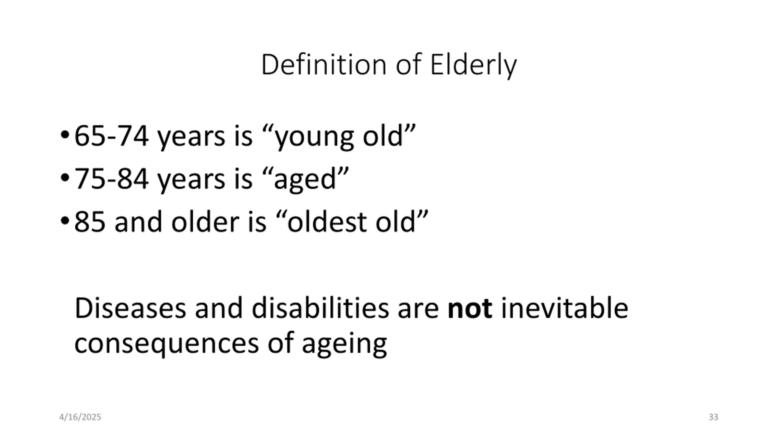 Definition of Elderly 65-74 years is young old 75-84 years is aged 85 and older is oldest old Diseases and disabilities are not inevitable consequences of ageing 4/16/2025 33