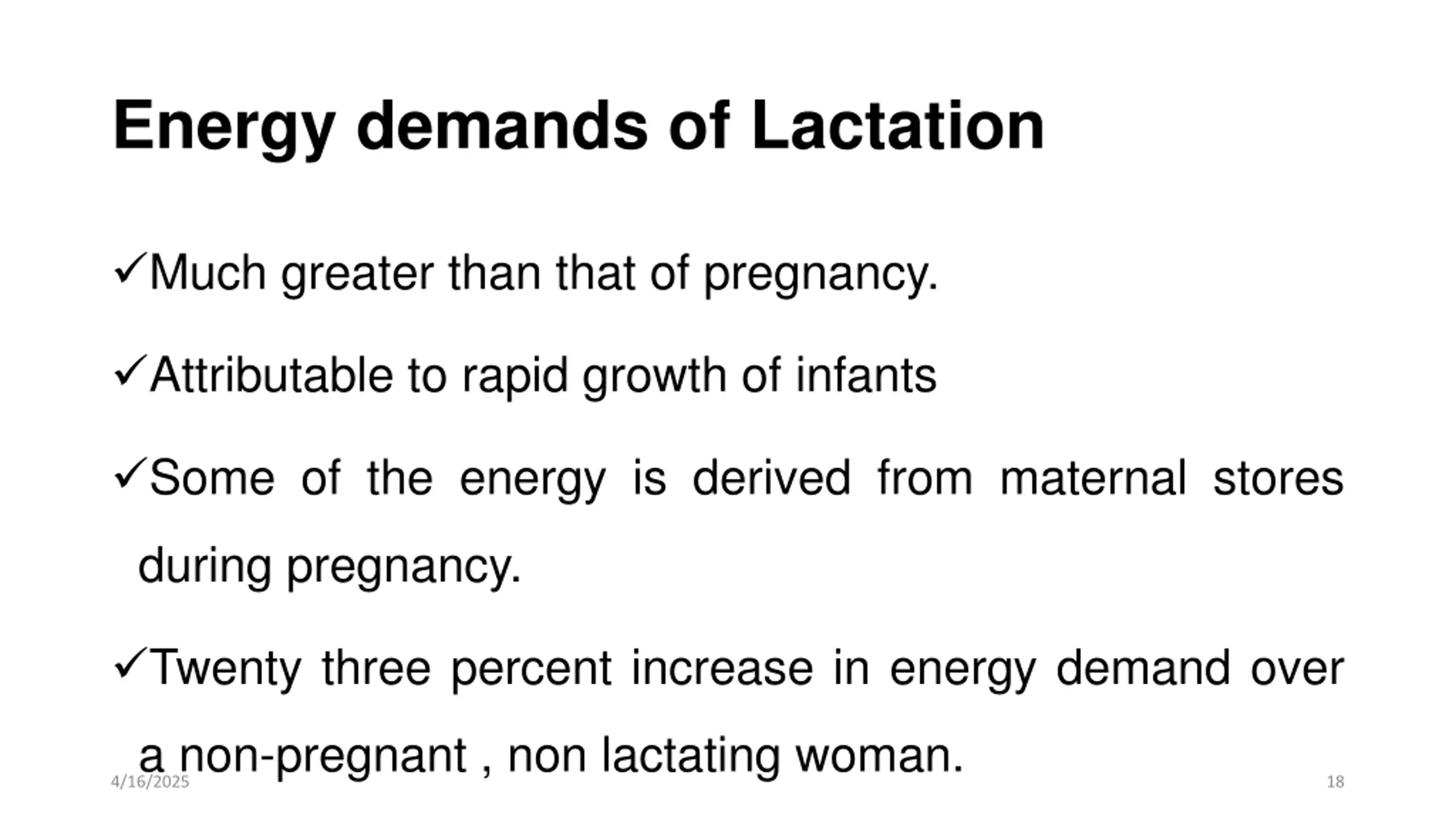 Energy demands of Lactation Much greater than that of pregnancy. Attributable to rapid growth of infants Some of the energy is derived from maternal stores during pregnancy. Twenty three percent increase in energy demand over a non-pregnant , non lactating woman. 4/16/2025 18