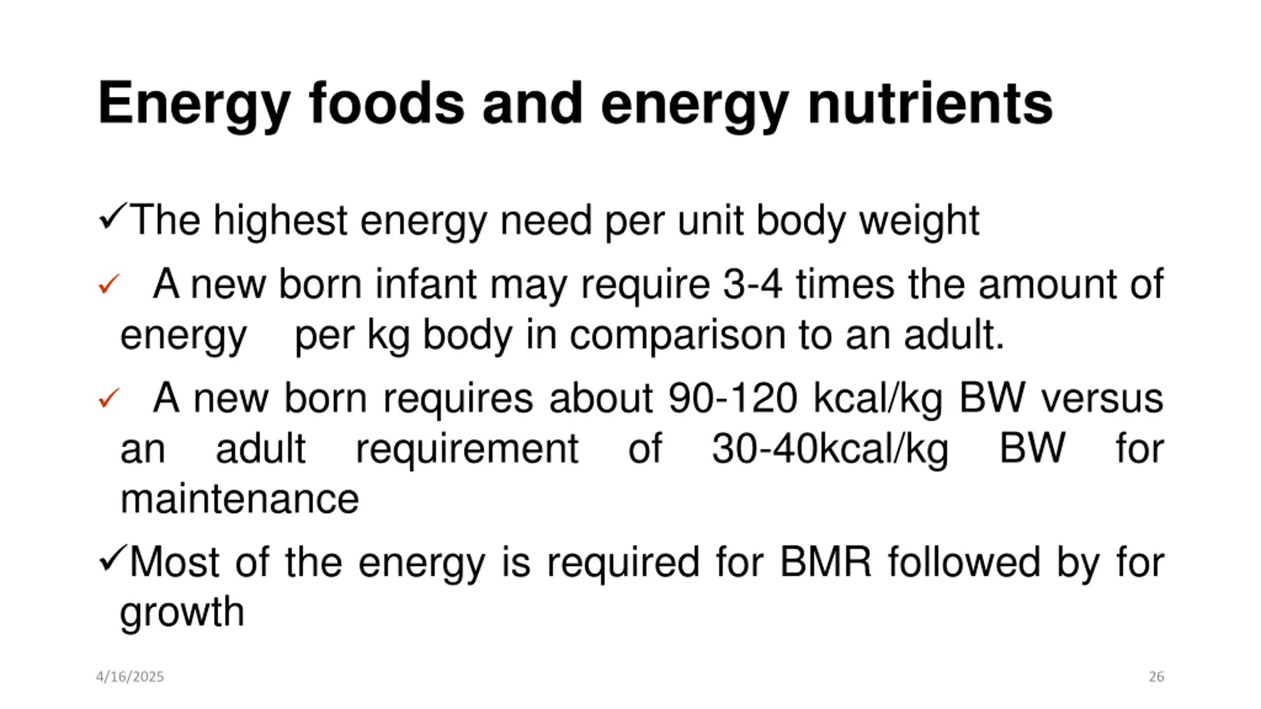 Energy foods and energy nutrients The highest energy need per unit body weight A new born infant may require 3-4 times the amount of energy per kg body in comparison to an adult. A new born requires about 90-120 kcal/kg BW versus an adult requirement of 30-40kcal/kg BW for maintenance Most of the energy is required for BMR followed by for growth 4/16/2025 26