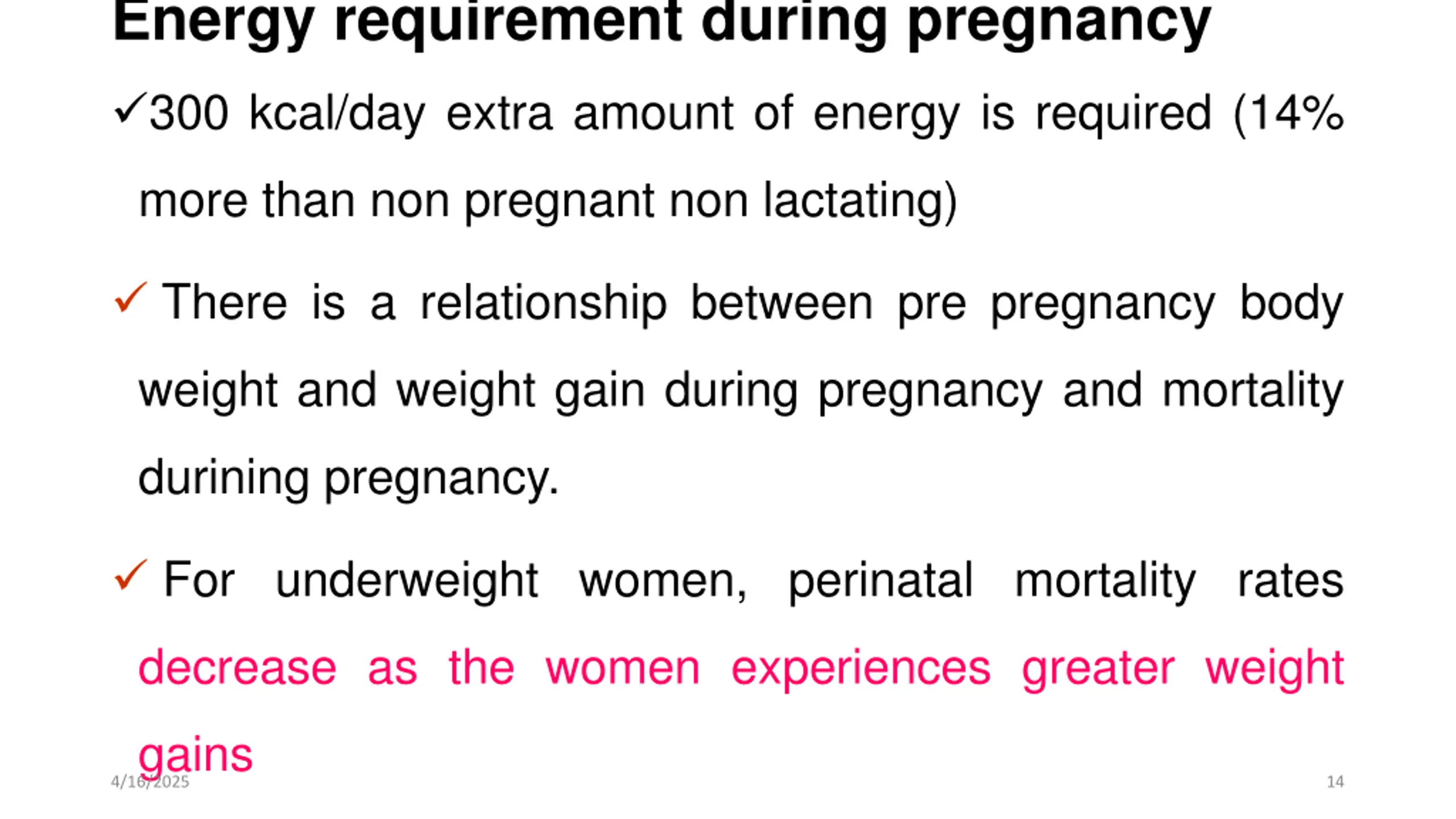 Energy requirement during pregnancy 300 kcal/day extra amount of energy is required (14% more than non pregnant non lactating) There is a relationship between pre pregnancy body weight and weight gain during pregnancy and mortality durining pregnancy. For underweight women, perinatal mortality rates decrease as the women experiences greater weight gains 4/16/2025 14