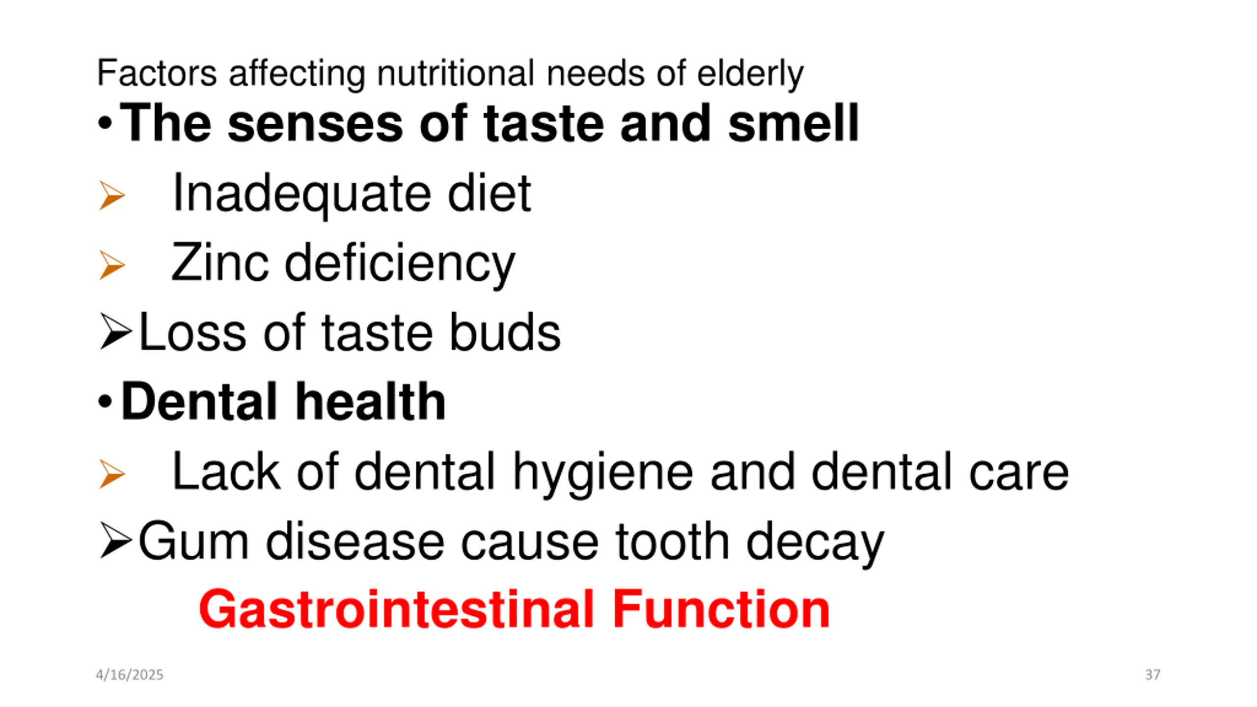 Factors affecting nutritional needs of elderly The senses of taste and smell Inadequate diet Zinc deficiency Loss of taste buds Dental health Lack of dental hygiene and dental care Gum disease cause tooth decay Gastrointestinal Function 4/16/2025 37