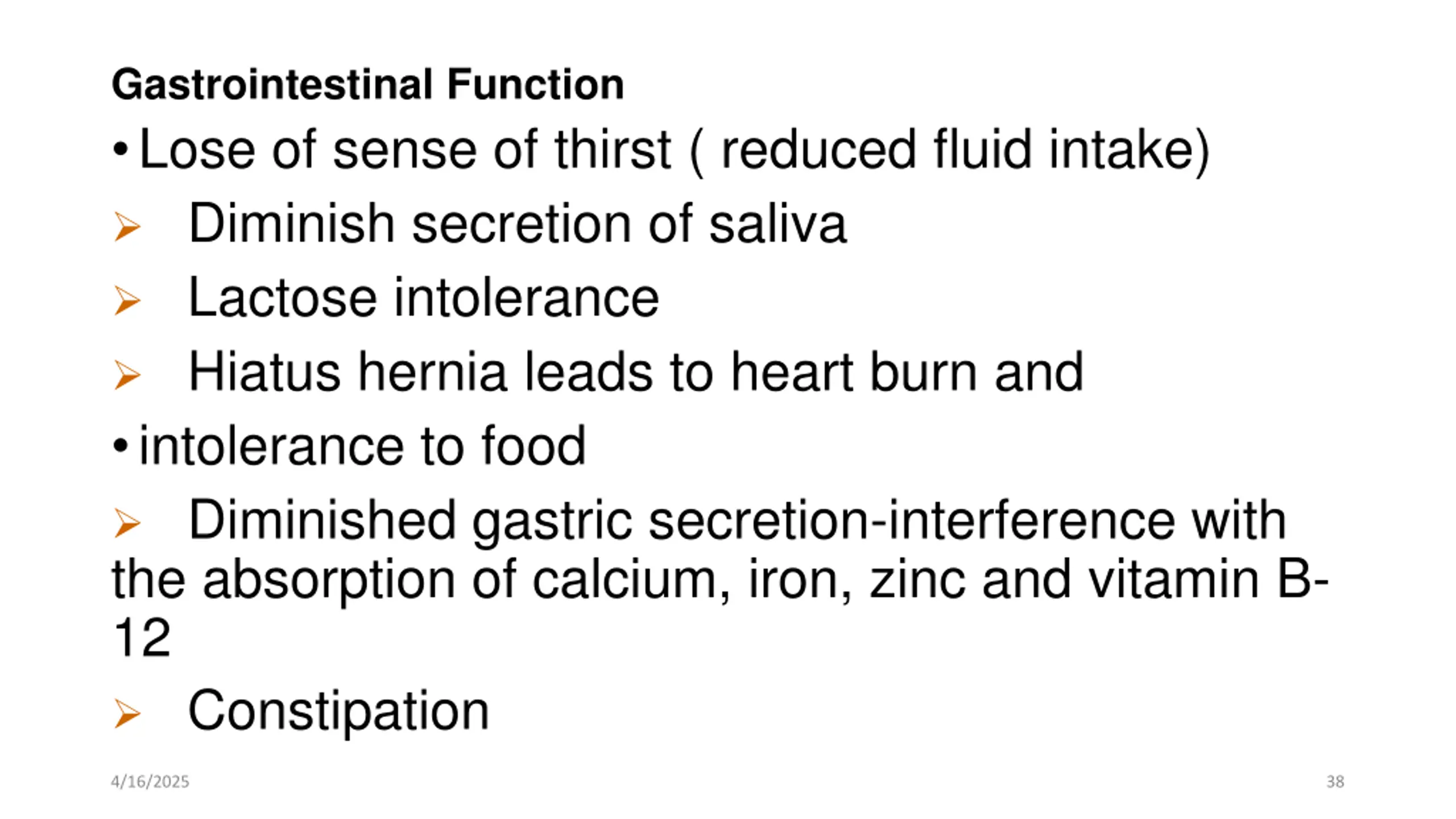 Gastrointestinal Function Lose of sense of thirst ( reduced fluid intake) Diminish secretion of saliva Lactose intolerance Hiatus hernia leads to heart burn and intolerance to food Diminished gastric secretion-interference with the absorption of calcium, iron, zinc and vitamin B- 12 Constipation 4/16/2025 38