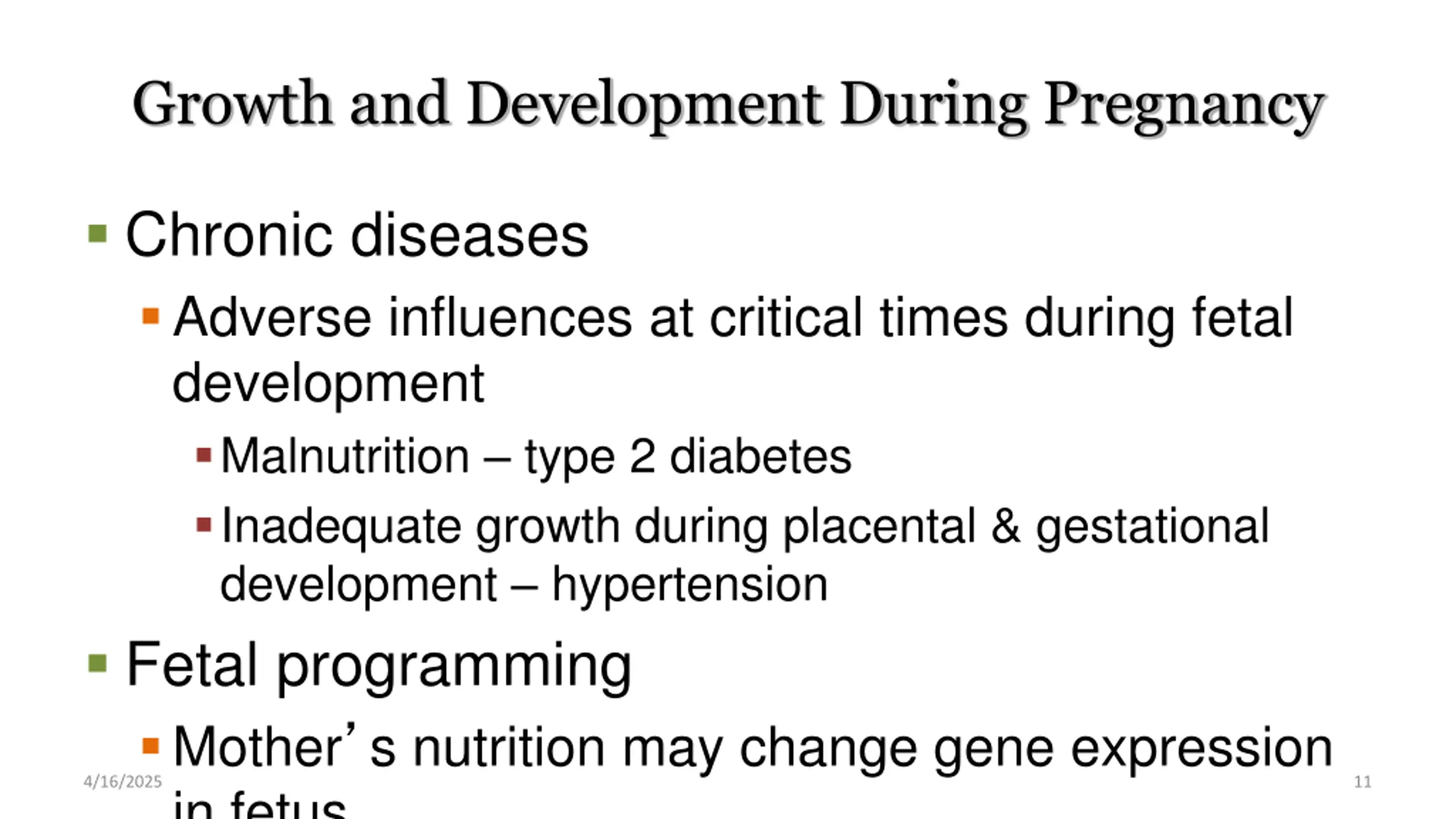 Growth and Development During Pregnancy Chronic diseases Adverse influences at critical times during fetal development Malnutrition type 2 diabetes Inadequate growth during placental & gestational development hypertension Fetal programming Mother s nutrition may change gene expression in fetus 4/16/2025 11
