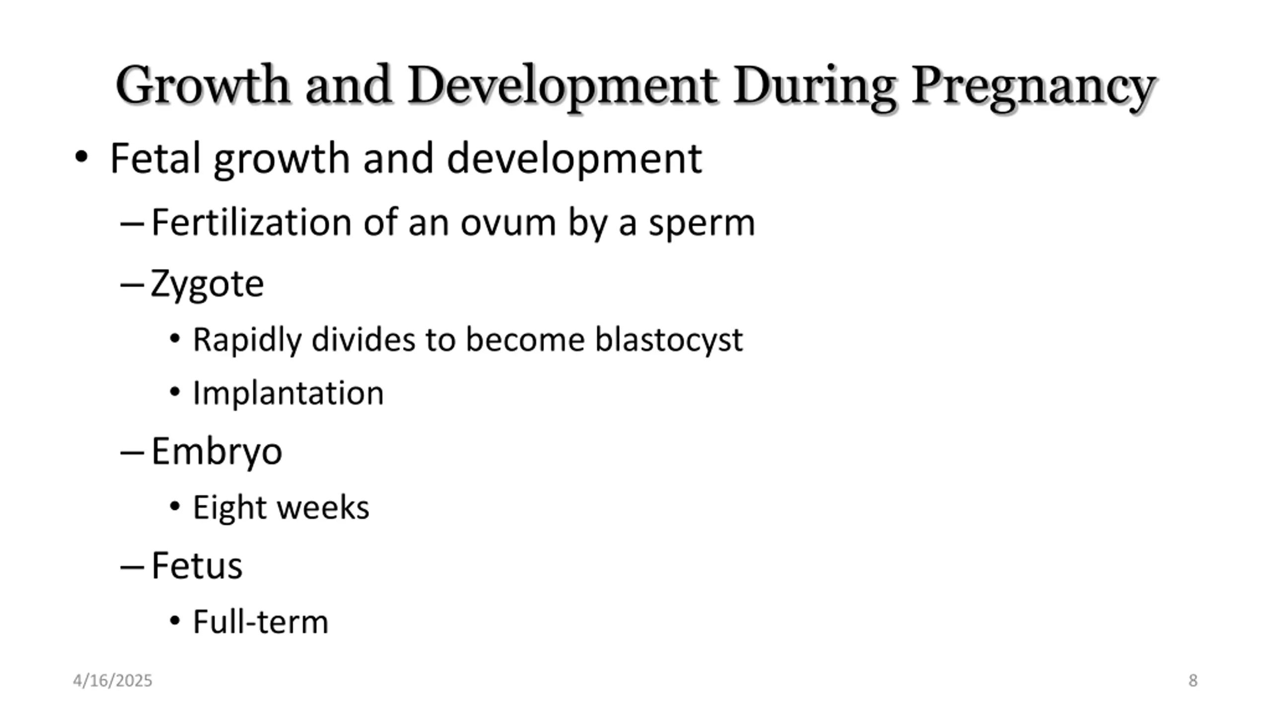 Growth and Development During Pregnancy Fetal growth and development Fertilization of an ovum by a sperm Zygote Rapidly divides to become blastocyst Implantation Embryo Eight weeks Fetus Full-term 4/16/2025 8