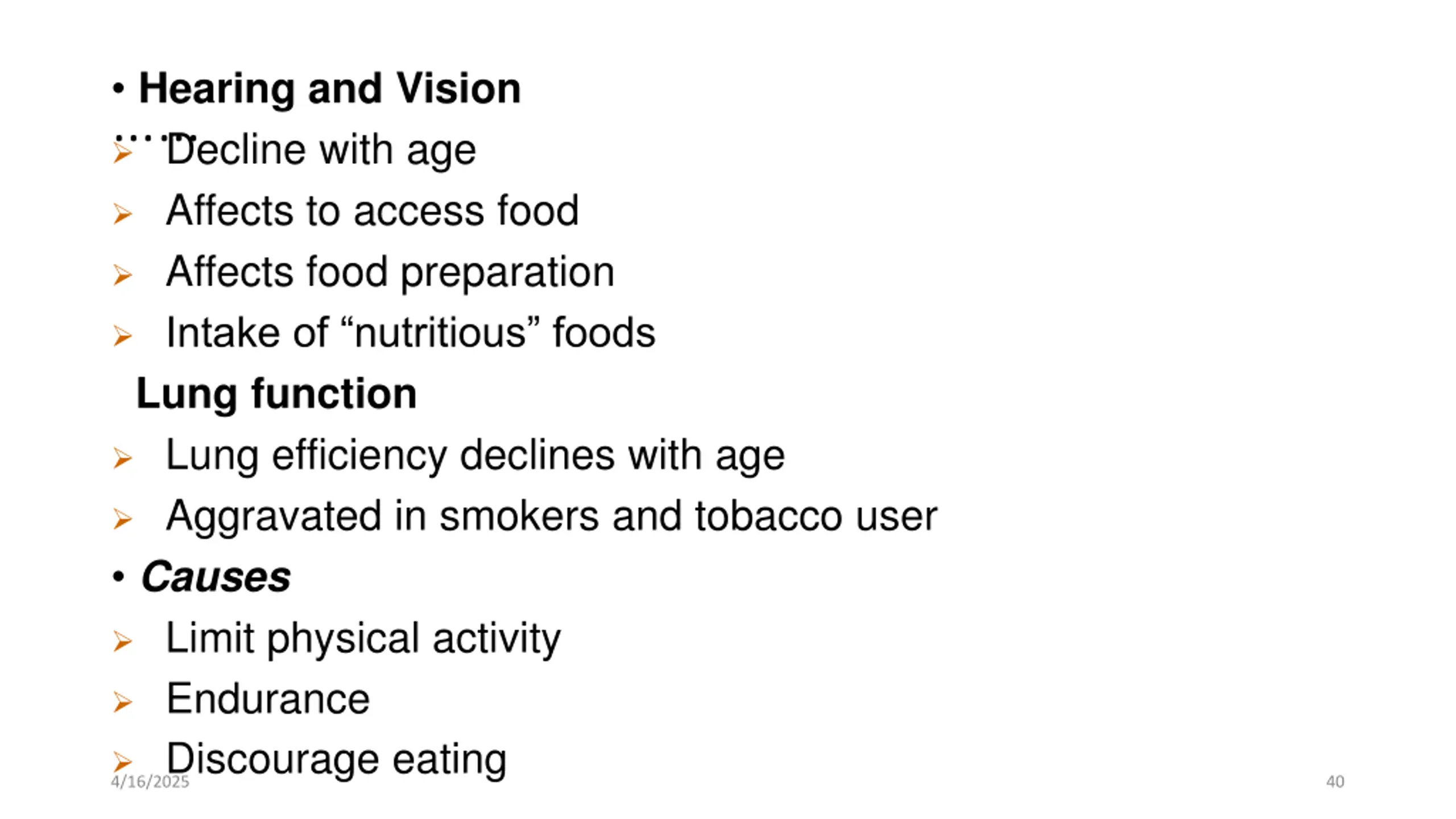Hearing and Vision Decline with age Affects to access food Affects food preparation Intake of nutritious foods Lung function Lung efficiency declines with age Aggravated in smokers and tobacco user Causes Limit physical activity Endurance Discourage eating 4/16/2025 40