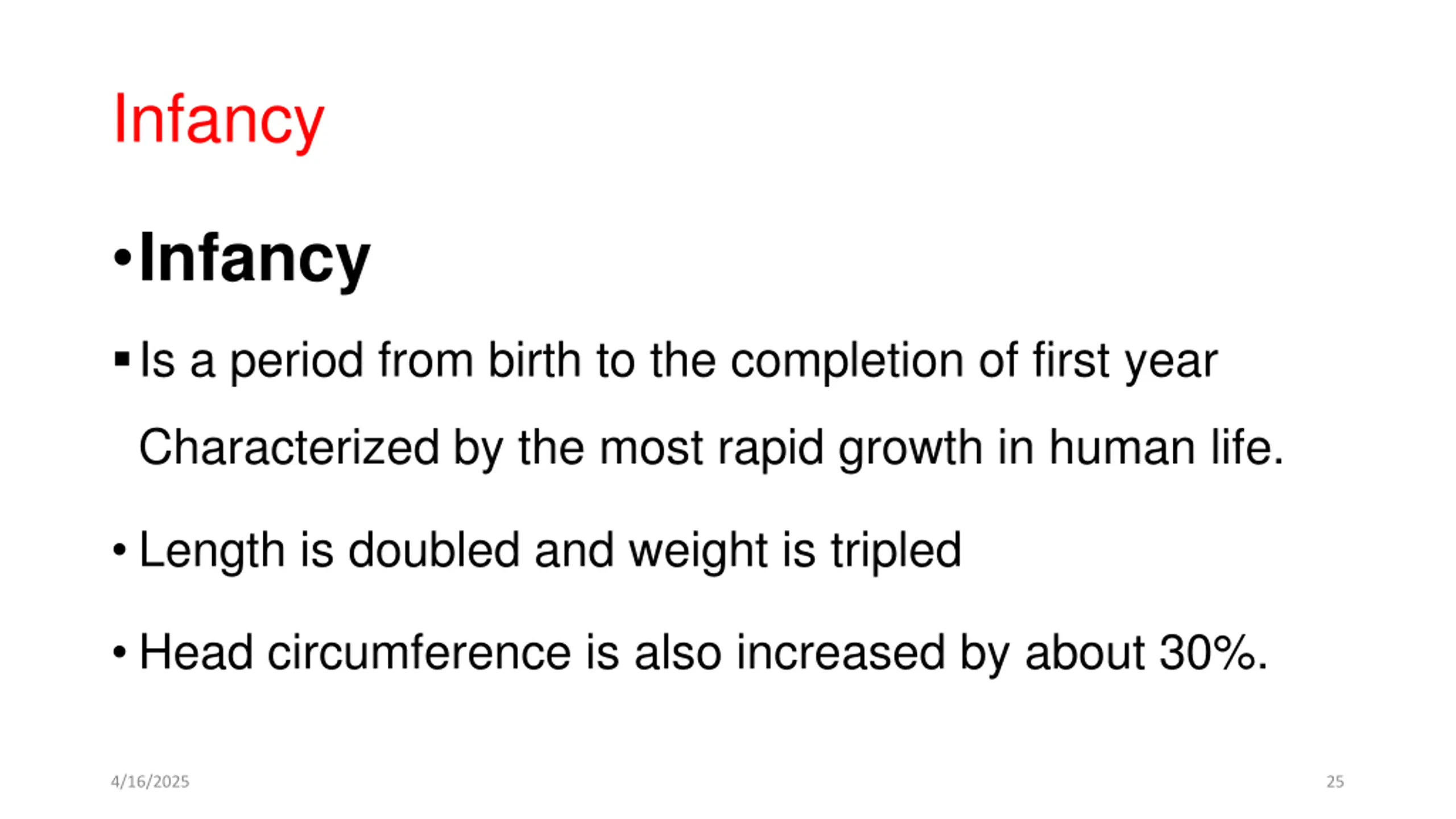 Infancy Infancy Is a period from birth to the completion of first year Characterized by the most rapid growth in human life. Length is doubled and weight is tripled Head circumference is also increased by about 30%. 4/16/2025 25