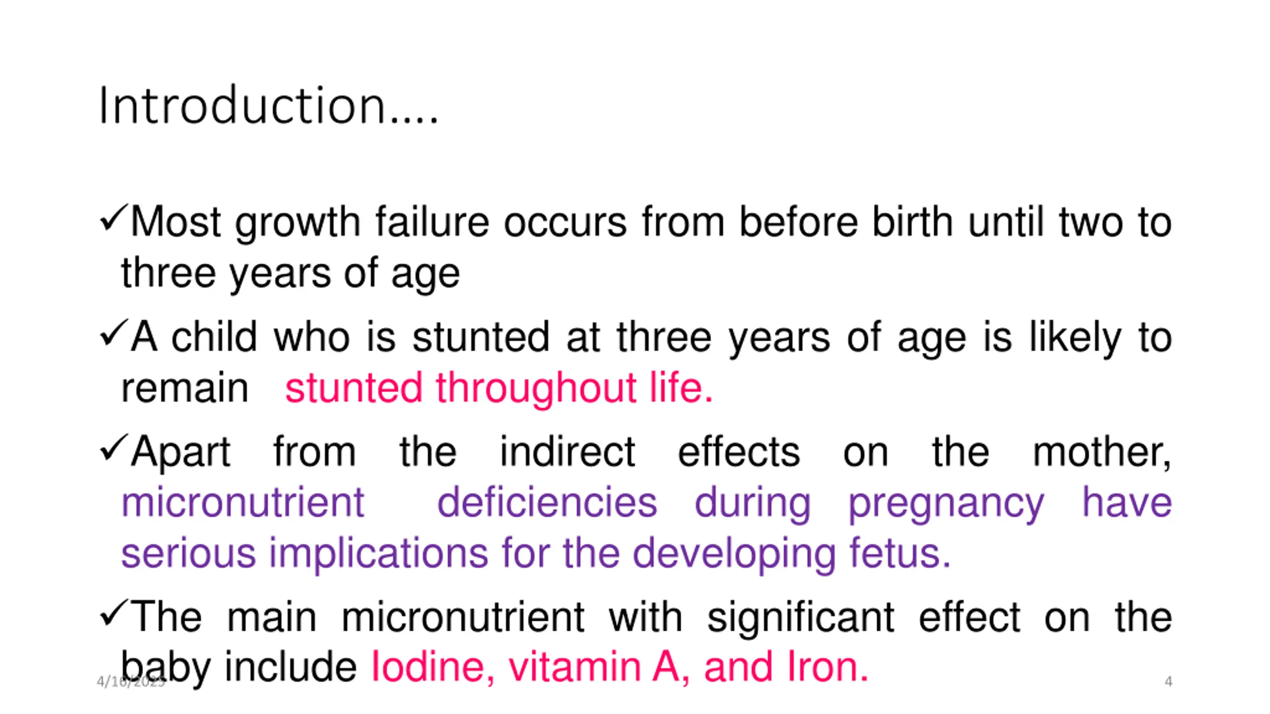 Introduction. Most growth failure occurs from before birth until two to three years of age A child who is stunted at three years of age is likely to remain stunted throughout life. Apart from the indirect effects on the mother, micronutrient deficiencies during pregnancy have serious implications for the developing fetus. The main micronutrient with significant effect on the baby include Iodine, vitamin A, and Iron. 4/16/2025 4