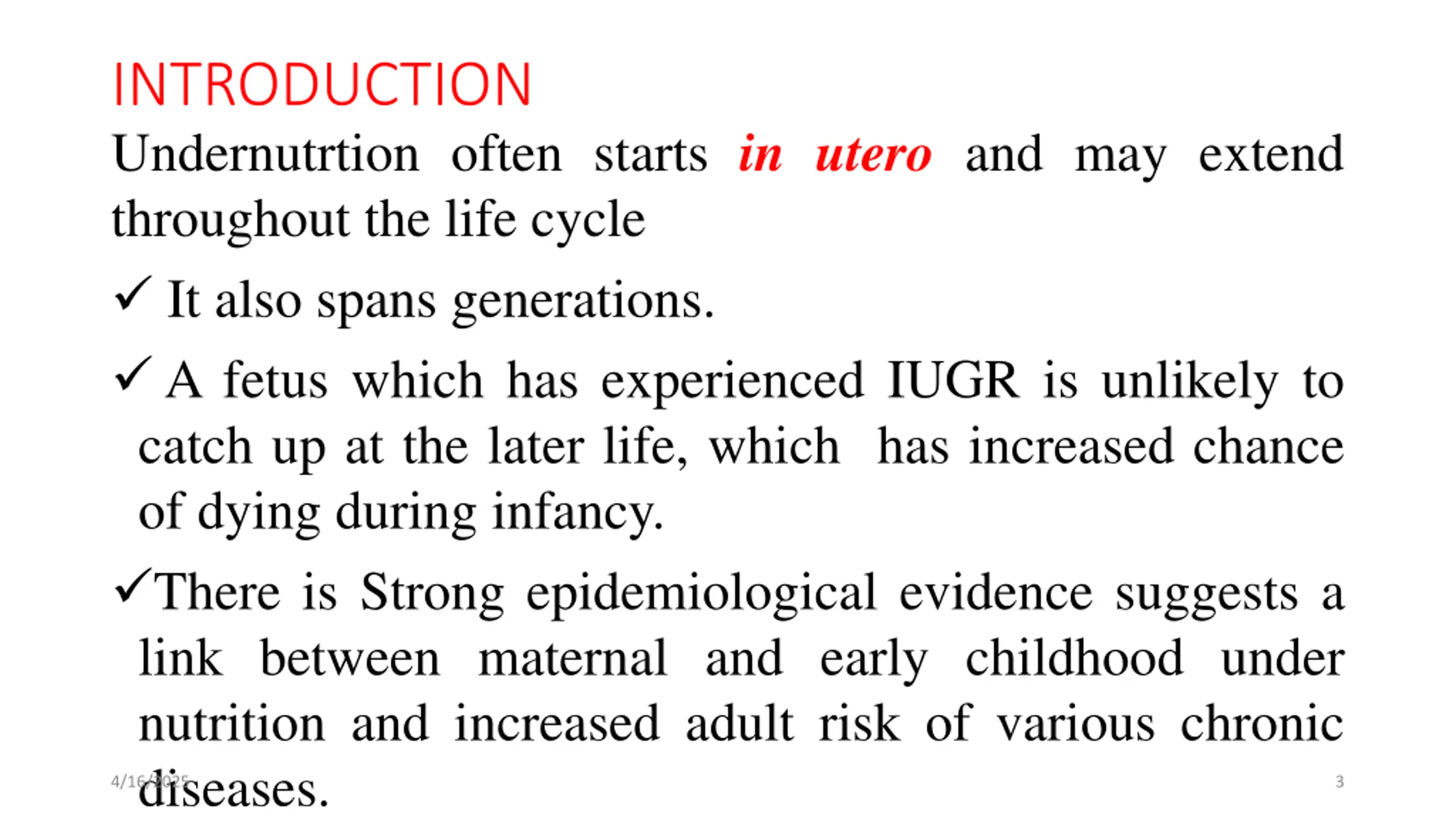 INTRODUCTION Undernutrtion often starts in utero and may extend throughout the life cycle It also spans generations. A fetus which has experienced IUGR is unlikely to catch up at the later life, which has increased chance of dying during infancy. There is Strong epidemiological evidence suggests a link between maternal and early childhood under nutrition and increased adult risk of various chronic diseases. 4/16/2025 3