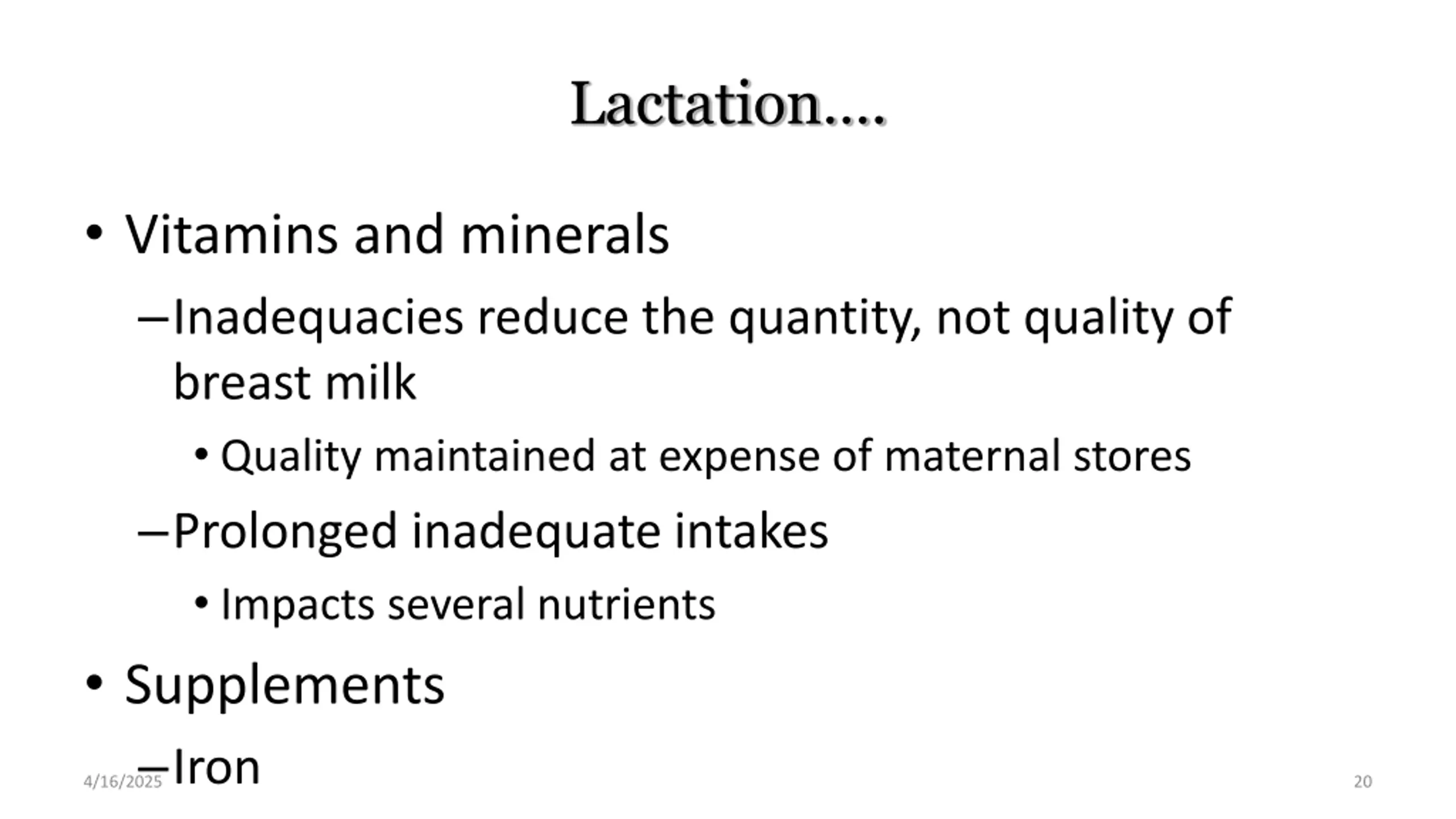 Lactation. Vitamins and minerals Inadequacies reduce the quantity, not quality of breast milk Quality maintained at expense of maternal stores Prolonged inadequate intakes Impacts several nutrients Supplements Iron 4/16/2025 20