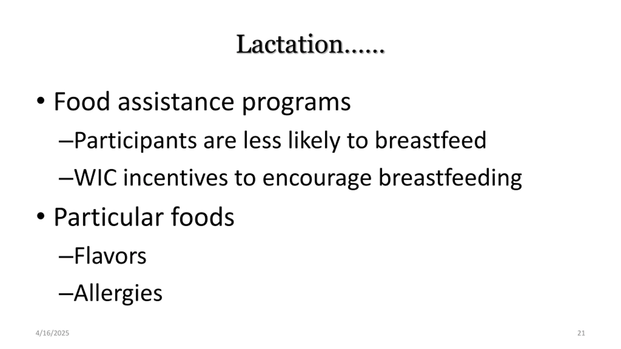 Lactation Food assistance programs Participants are less likely to breastfeed WIC incentives to encourage breastfeeding Particular foods Flavors Allergies 4/16/2025 21