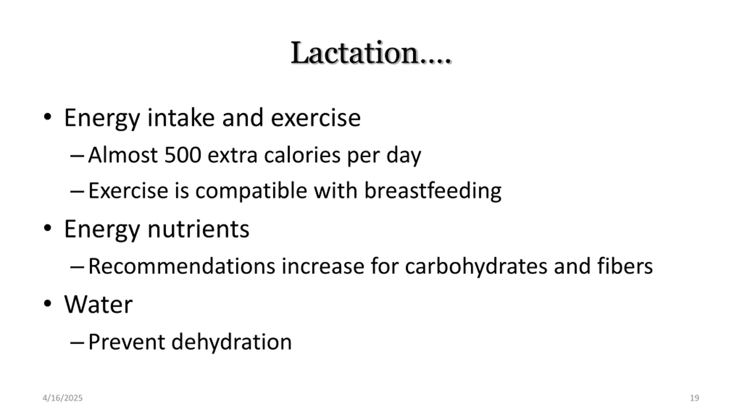 Lactation. Energy intake and exercise Almost 500 extra calories per day Exercise is compatible with breastfeeding Energy nutrients Recommendations increase for carbohydrates and fibers Water Prevent dehydration 4/16/2025 19