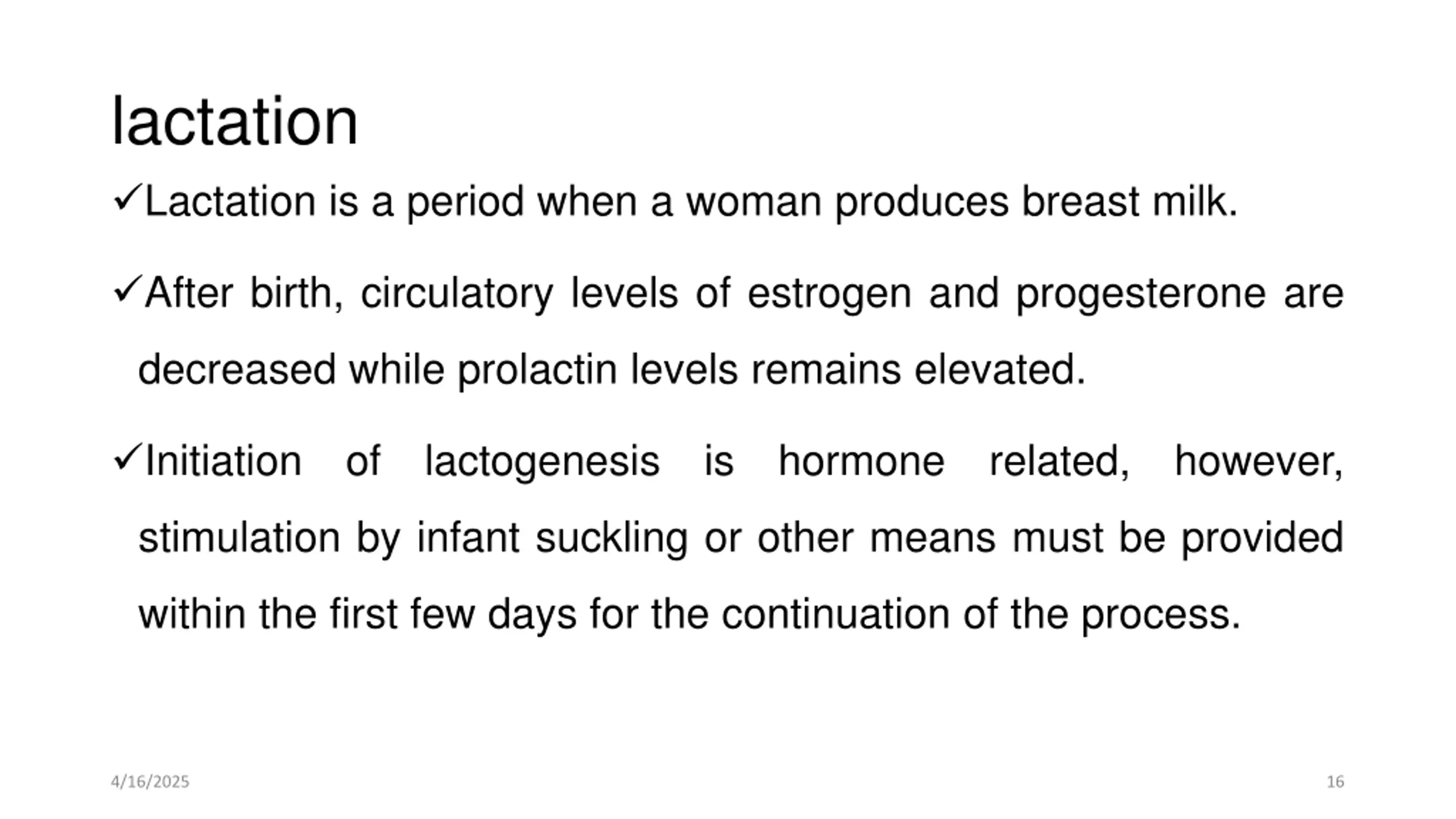 lactation Lactation is a period when a woman produces breast milk. After birth, circulatory levels of estrogen and progesterone are decreased while prolactin levels remains elevated. Initiation of lactogenesis is hormone related, however, stimulation by infant suckling or other means must be provided within the first few days for the continuation of the process. 4/16/2025 16